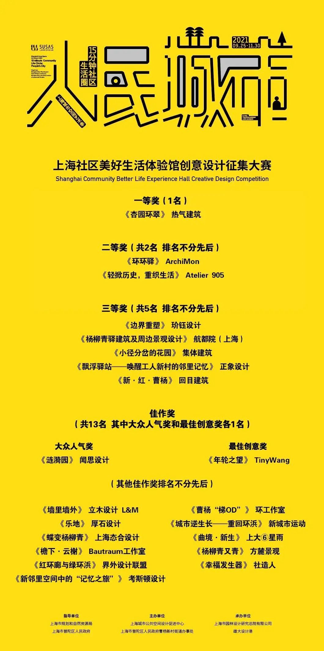 2021年12月7日,“上海社区美好生活体验馆”创意征集大赛专家评审会在曹杨新村街道社区活动中心召开,在21个初选方案基础上,评选出1个一等奖、2个二等奖、5个三等奖。