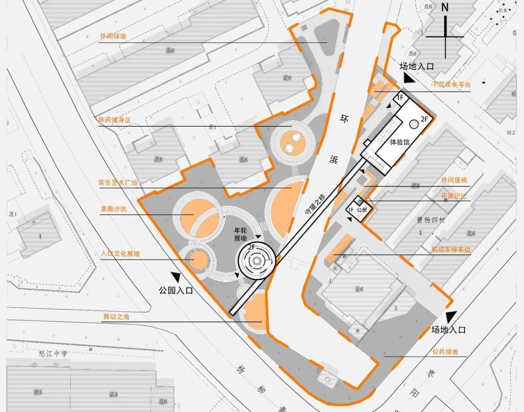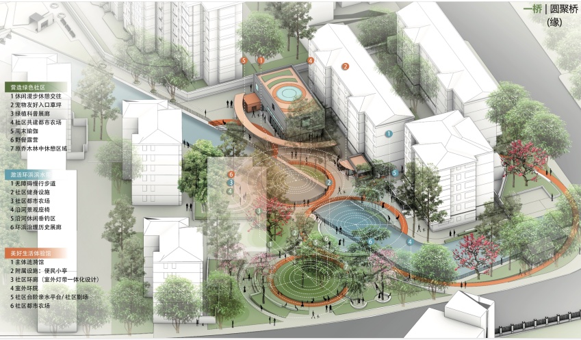方案亮点围绕着“营造绿色社区”、“激活环浜滨水带”和“美好生活体验馆”三大主题,设置了大小不一的圆。