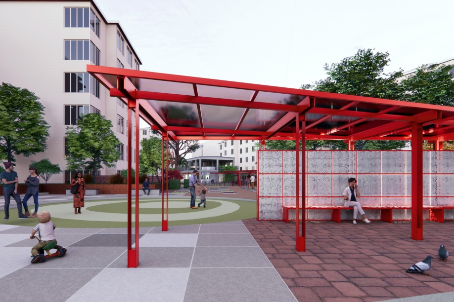 设计亮点是将原场地内一大一小两栋建筑通过围墙联系,与河岸形成夹角,空间关系被动消极。与曹杨新村的红色精神传统相呼应,构筑物均采用红色钢结构与红色阳光板顶棚,保持共同的建造逻辑与变化的光影效果。