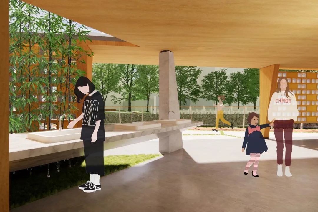 方案设计亮点是将环廊侵入至建筑红线内,形成连续的半室外空间,并通过偏转内部墙面方向,加强室内外的联系,使得建筑的西南沿水面获得最大限度的景观资源。通过环廊构筑物将城市、社区等四面八方来的人群引导至其中,进而沿着廊下进入环环驿(社区美好生活体验馆),公厕设计在建筑的东北角,拥有独立的出入口,服务于驿站的同时也可以24H服务于市民,增强场地空间的公共性与社区内部的共有性。