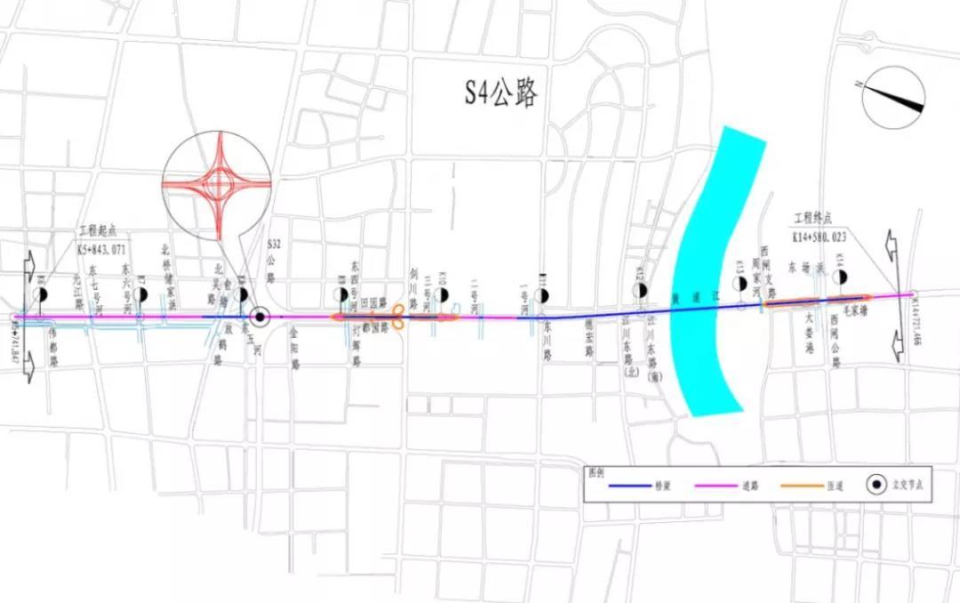 同步实施新建桥梁24座、箱涵2座、路灯工程、绿化工程、交安工程、桥梁景观装饰工程等。道路等级四级公路,设计速度20km/h,道路标准段(0.5路肩+2.5非机道+3.5机动车道+0.5路肩)。