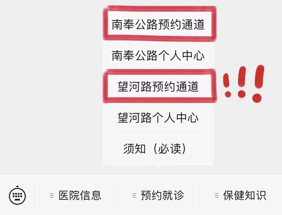 望河路门诊部与南奉公路门诊部为不同预约通道,预约就诊时请仔细查看、慎重选择,以免耽误就诊!!!