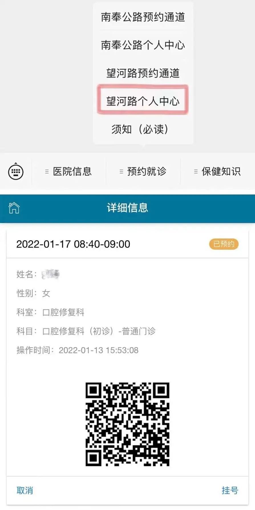 ④菜单栏点选“望河路个人中心”查看预约信息