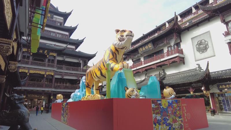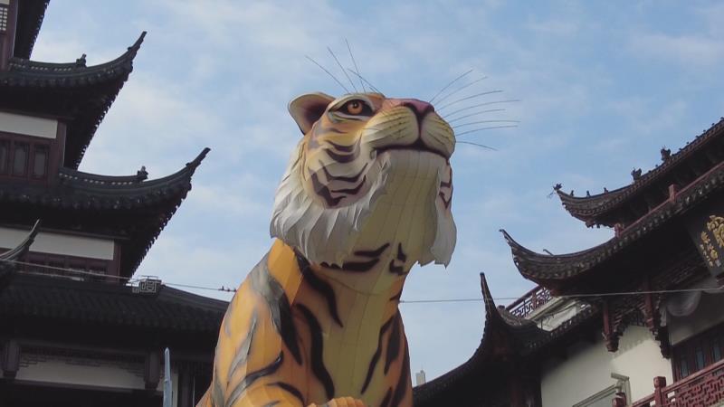 在豫园中心广场,一组主题为“虎跃东方”的灯组已初具模型,一只高约9米的生肖虎灯组立于山头,眺望未来。它的身前,是手持国旗的宇航虎;巍峨的冰山上,参加北京冬奥会的滑雪虎跃过冰面,与航空母舰上帅气的指挥虎相映成趣。走过路过的市民游客都忍不住抢先与大老虎来个霸气合影。