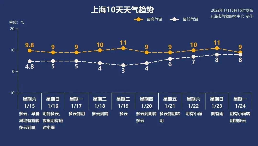 明日起至21日,申城受冷高压控制,天气平稳,以多云为主。气温变化不大,3℃-10℃之间。