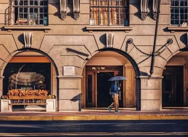 走近武康大楼,感受到的不仅是这座建筑的风姿,更能感受到整个片区的风貌与腔调。沿着淮海中路漫步,沿街铺面的店招、门楣、雨花石外墙等丰富而协调,老建筑特有的风情与武康大楼融为一体。