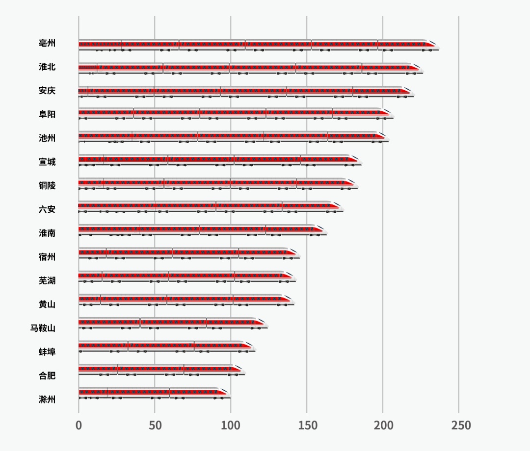 合肥经由京港高铁安九段至南昌、深圳方向分别增开动车组列车1对、2对,较调图前最短运行里程分别减少268公里、209公里;合肥至南昌、深圳最快运行时间分别为2小时22分钟、6小时48分钟,较调图前分别压缩1小时38分钟、2小时15分钟。