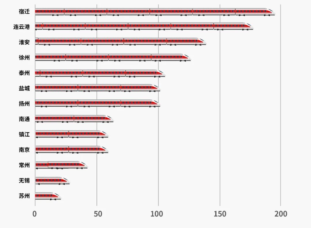 新图中,长三角铁路优化调整部分短途旅客列车开行结构。其中盐城至南京南增开C3262/59次列车,全程运行时间2小时29分钟,是两地间最快动车组列车。安庆增开至盐城D5526/7次列车,经由芜湖、马鞍山、南京、镇江、扬州、淮安等城市,增加了下午客流高峰时段安庆至南京、南京至盐城方向运力。苏州~上海G7203次列车延长运行区段为无锡~上海,使无锡站早通勤高峰时段有了始发列车,无锡至上海早通勤旅客出行更方便。合肥南开行至上海虹桥G7726/7 G7725/8次列车,途经无为、芜湖、马鞍山、南京、常州、无锡、苏州等城市,结束了无为没有直达上海方向列车的历史。南京至盐城C3158/5 C3181/0次列车延伸至南通站,途经宁镇、淮扬、淮盐通地区,在苏北地区形成一条半环形列车运行路线,结束了东台至省会南京没有高铁列车的历史。此外,铁路部门还对上海虹桥~池州G7206/7次、黄山北~上海虹桥G7304/G7301次、安庆~杭州东G7408/5 G7406/7次等列车运行区段进行调整。