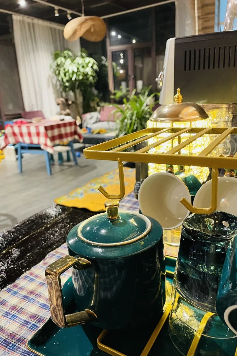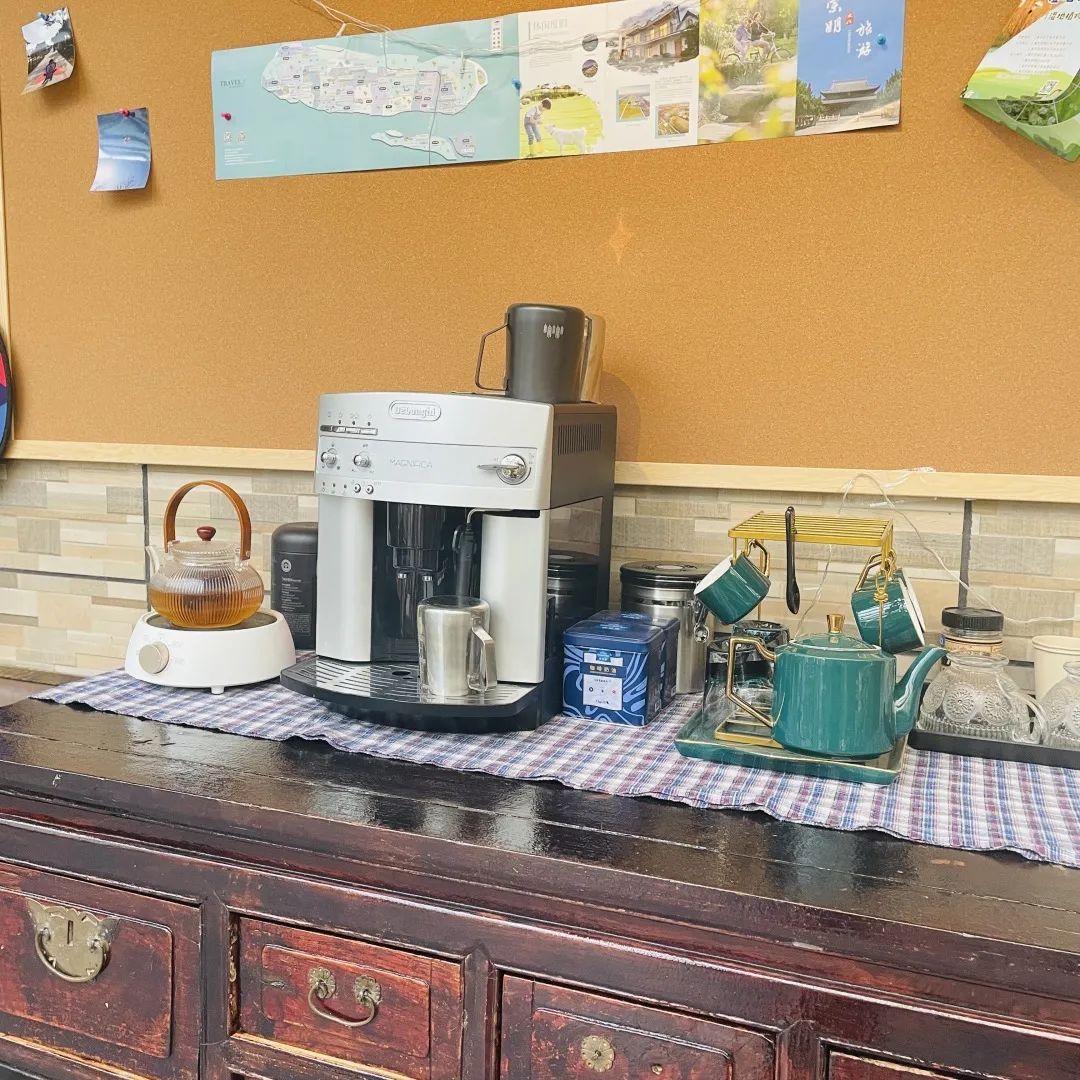 原野民宿里有一处复古味极浓的咖啡角,桌子是主人外婆的嫁妆,有80多年历史。西式的咖啡机摆在中式的案桌上别有一番韵味,常常有客人倚着桌边,边等咖啡边看书。