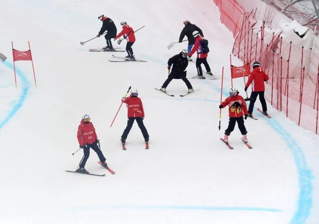 延庆赛区国家高山滑雪中心的工作人员正在检查和修整赛道 l 新华社