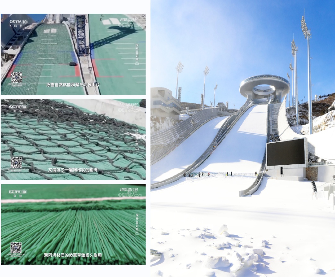 (左)赛道铺设过程 CCTV《创新进行时》;(右)国家跳台滑雪中心“雪如意” 武殿森摄(人民图片网)