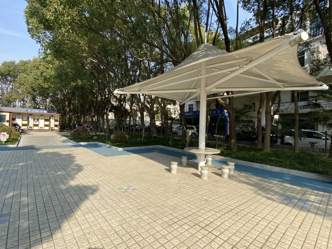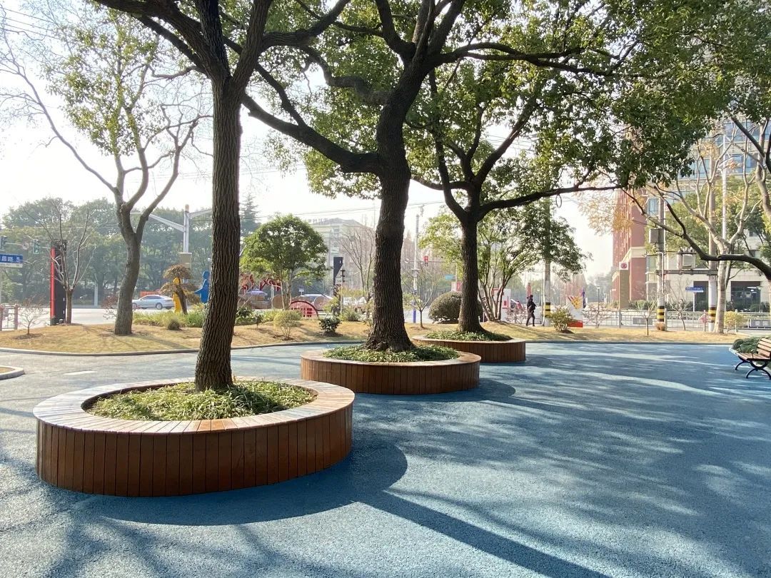 带有顶棚的环形座椅不仅能让人坐下休憩,还能为人们遮风挡雨,有的花坛座椅以树荫为顶,既是种植池,又是景观座椅,相得益彰。