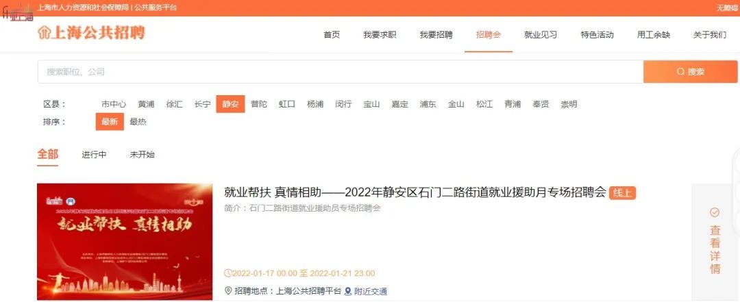 欲了解岗位详细信息,请登录上海公共招聘平台(http://jobs.rsj.sh.gov.cn),点击“招聘会”→选择“静安”→进入招聘会界面。