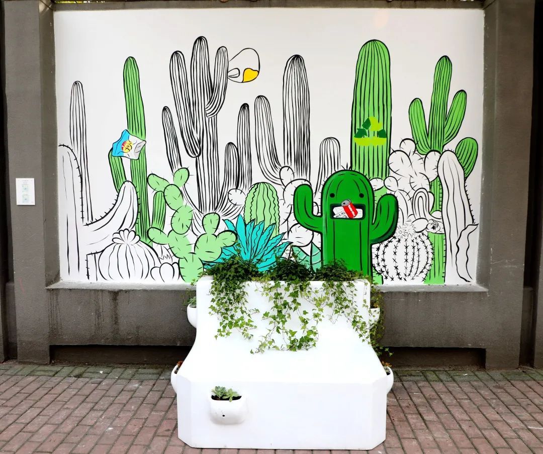 作品以种植花坛为造型,以各种植物为设计元素,结合座椅的基础功能而设计。墙绘结合花坛椅主题,以花衬画、以画映花,来表达“魔方奉浦”充满魅力、生机勃勃的景象。