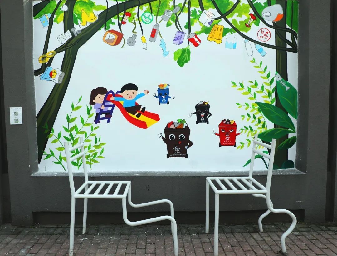 “city”椅,以英文字母“city”为主要造型,采用高低不一、大小不一的椅子,来体现包容性和丰富多彩的城市生活。椅子背后的墙绘结合city椅主题,以简约的奉浦建筑线稿为设计元素,点缀零星、活泼的色块,用丰富的色彩展现奉浦“椅子街道”的青春时尚。