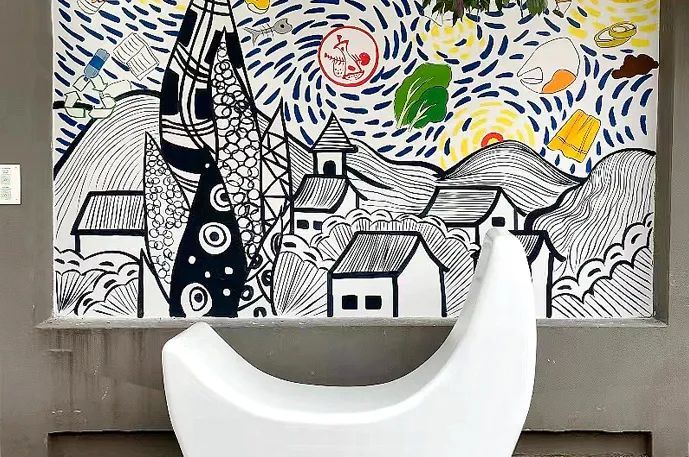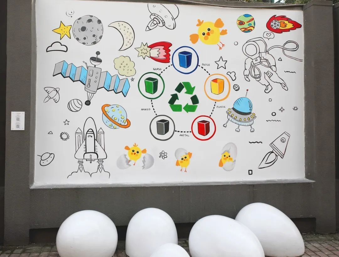 作品以蛋形为原型,高低不同的蛋形椅子从地面凸出,表达对梦想的孵化过程。椅的“蛋”代表着孵化。韩村路作为儿童梦想的孵化器,不仅能够孵化出儿童的各种奇思妙想,也孵化出当地企业的创新精神与探索精神。墙绘以夸张的艺术表现手法,辅以火箭、航天员等意象,展现了奉浦自由洒脱的城市意象。