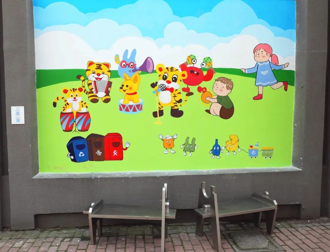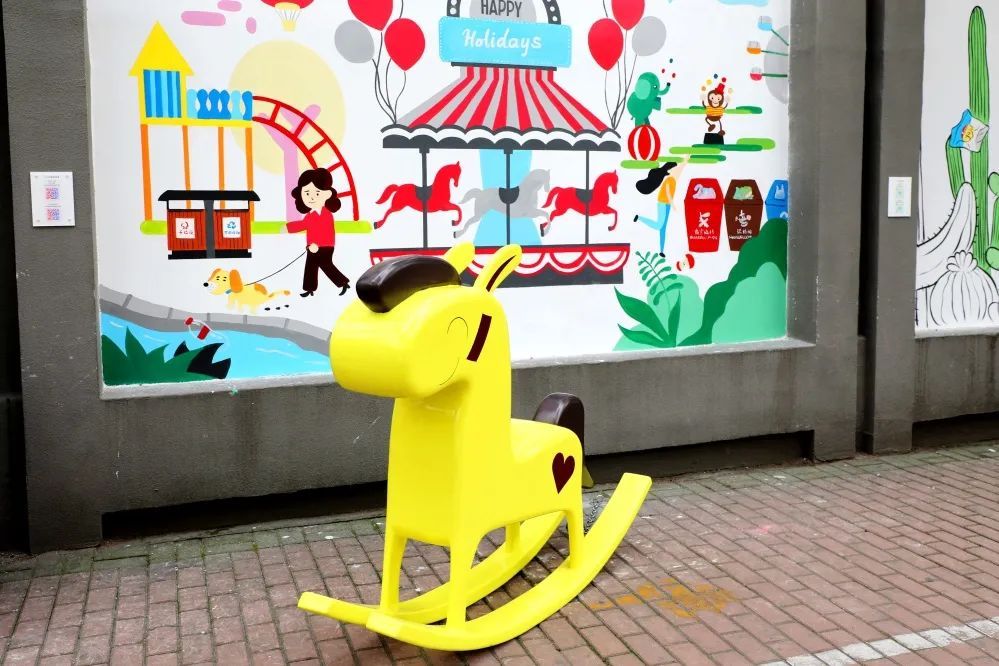 “小马椅”带给乘坐的人快乐,也寓意马到成功。墙绘借鉴孩子的儿童记忆元素,以儿童游乐园的场景展开设计。旋转木马、儿童滑梯、摩天轮和马戏团表演等画面,既能引起孩子们的共鸣,也让在附近上学的孩子们,拥有美好的艺术体验。