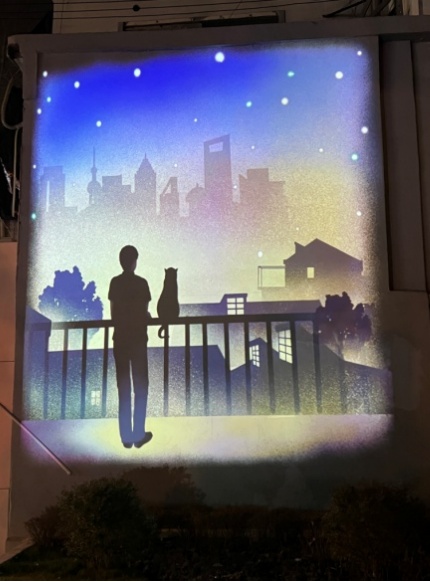 在记者的实地探访中,陶所长所说的惊喜无处不在。在新闸路258号侧墙,通过动画插画、动漫投影的形式,一副温馨而又感人的画面出现了:小男孩和他的宠物猫,倚着栏杆,眺望着远处的老城厢。插画师黄赛峰表示,这是以老城厢记忆里的时光为主题,想要表达对美好过往的珍视和对无限未来的向往。“这些场景融合了苏州河畔的过去、现在和未来。”