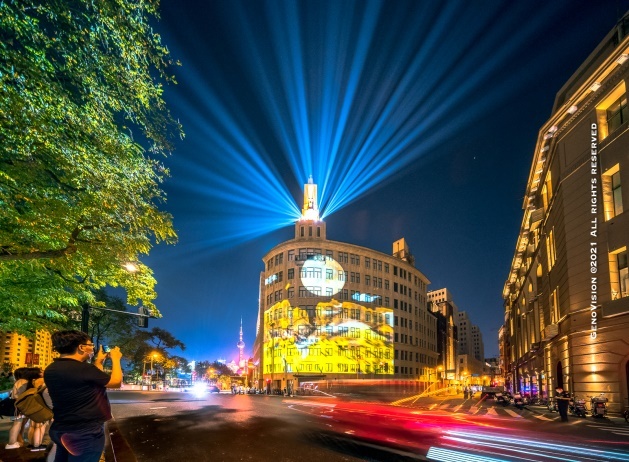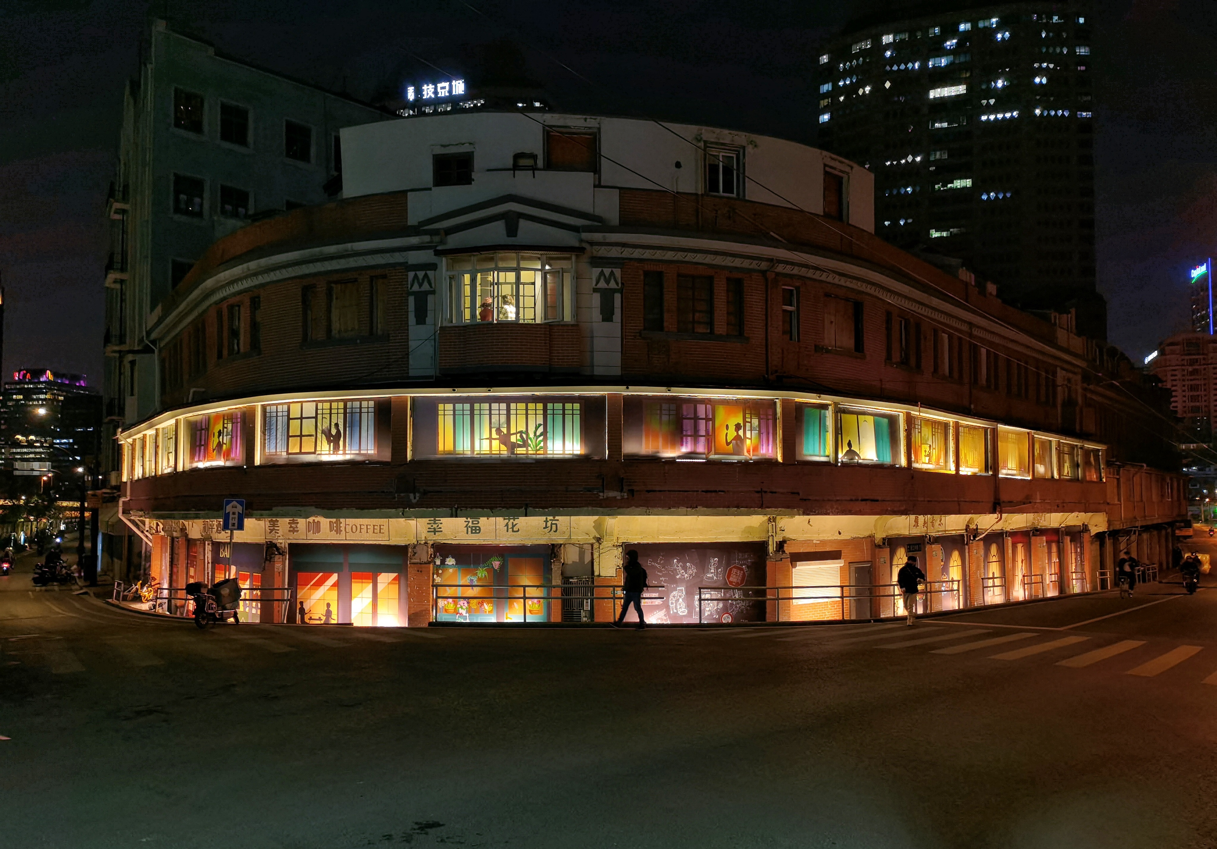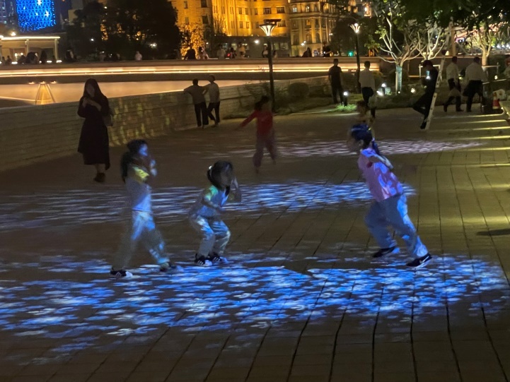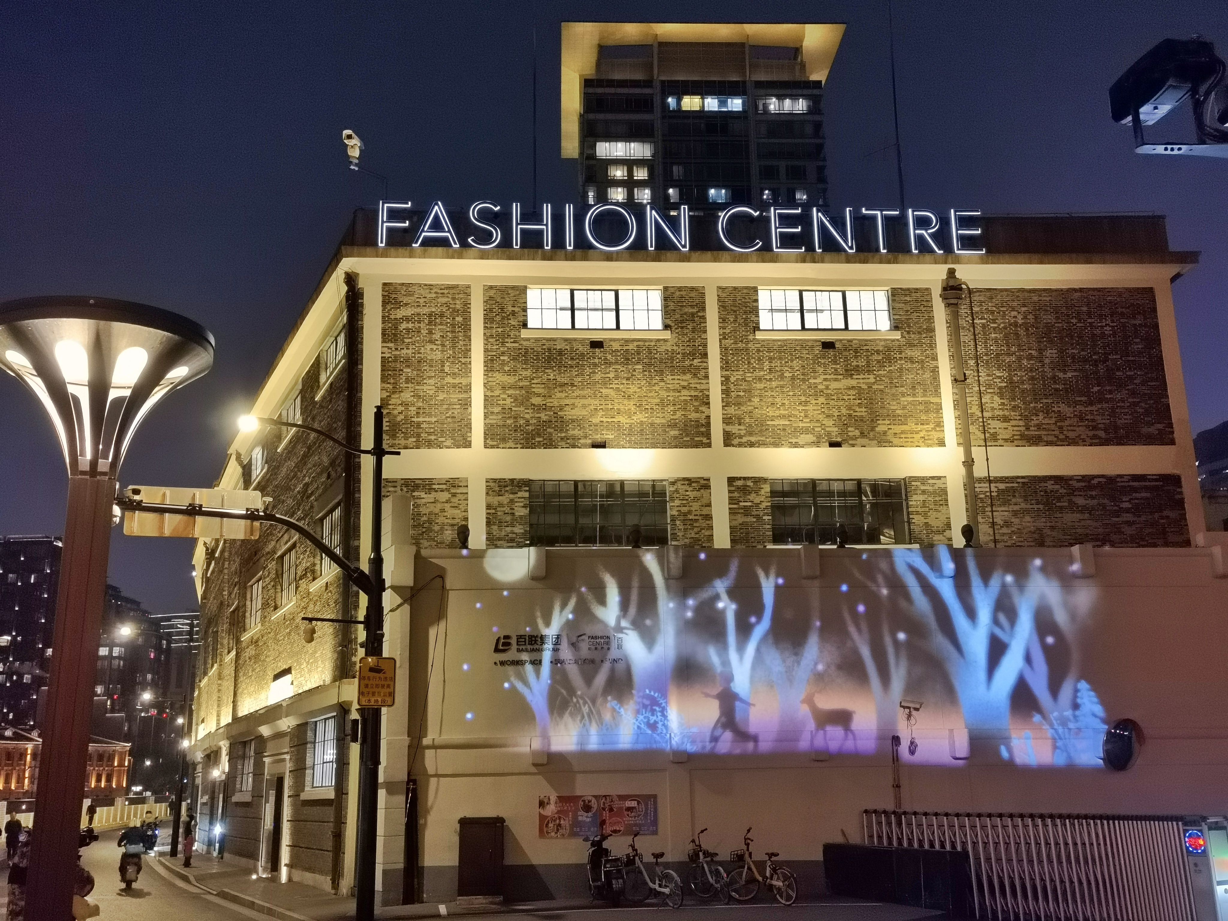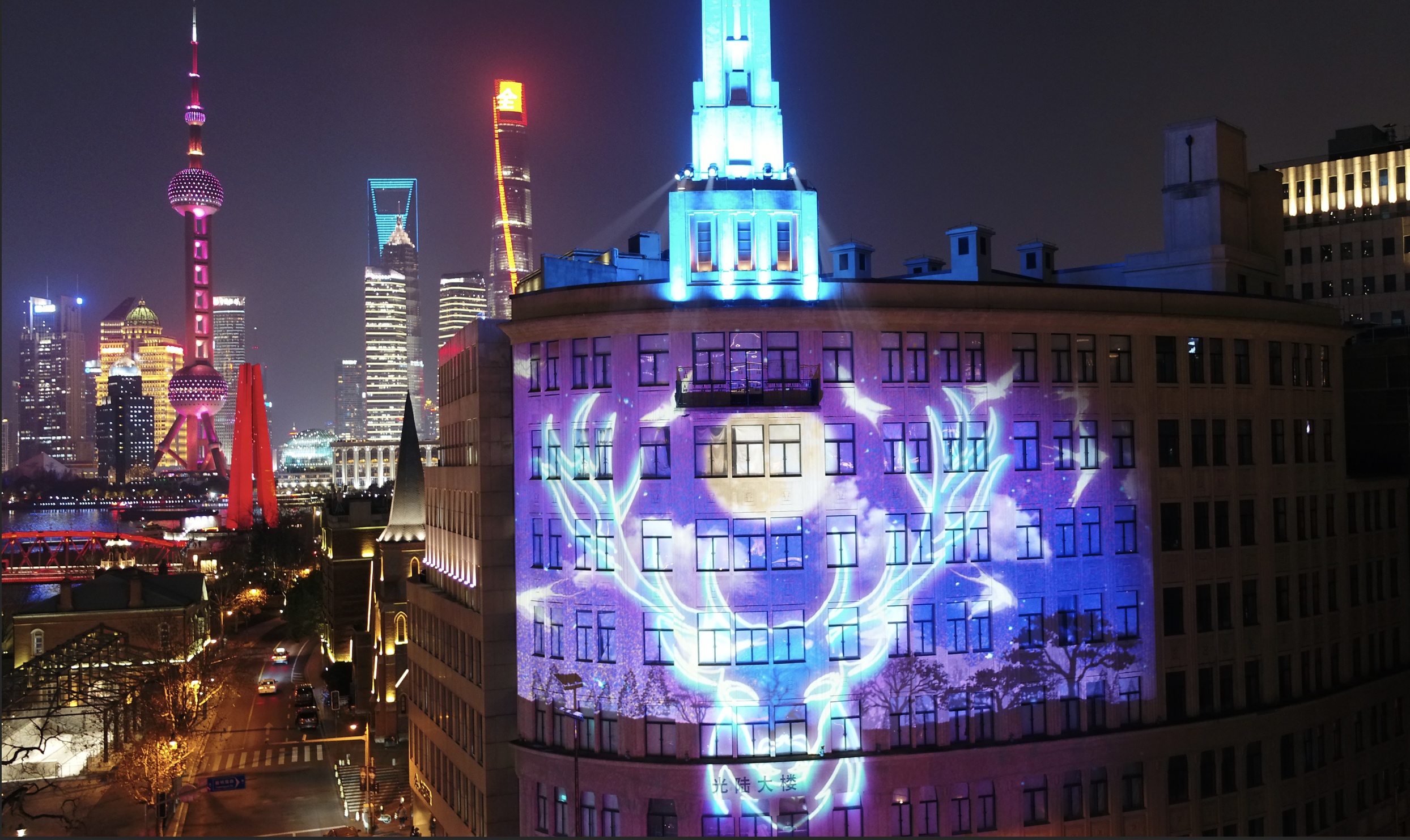 皎月星空下,南苏州路1295号的外立面上,以光入画,无数只萤火虫闪烁起舞,好似满天繁星,浪漫梦幻极致。孩子、鹿、鸽子、丛林等童年元素交替出现,让人在梦幻场景中,重拾起了苏州河畔儿时的记忆。