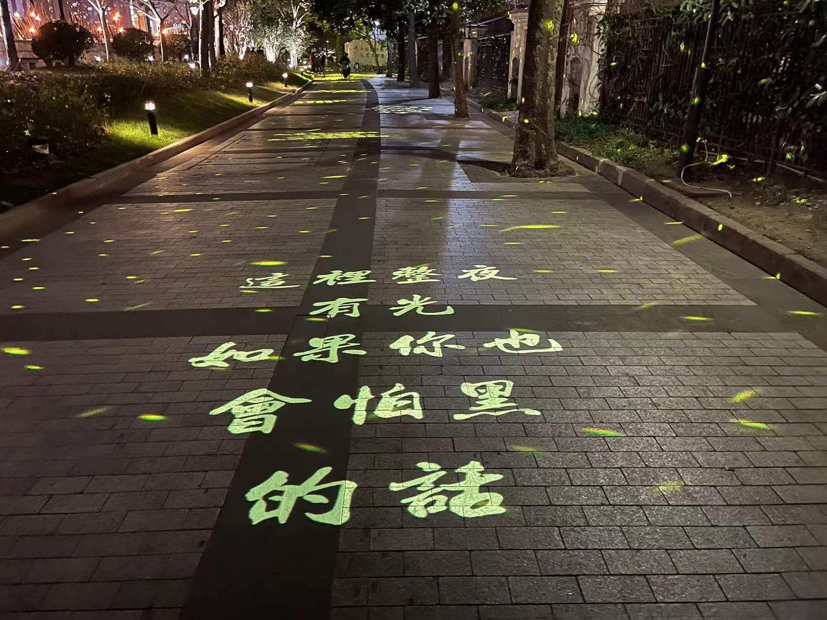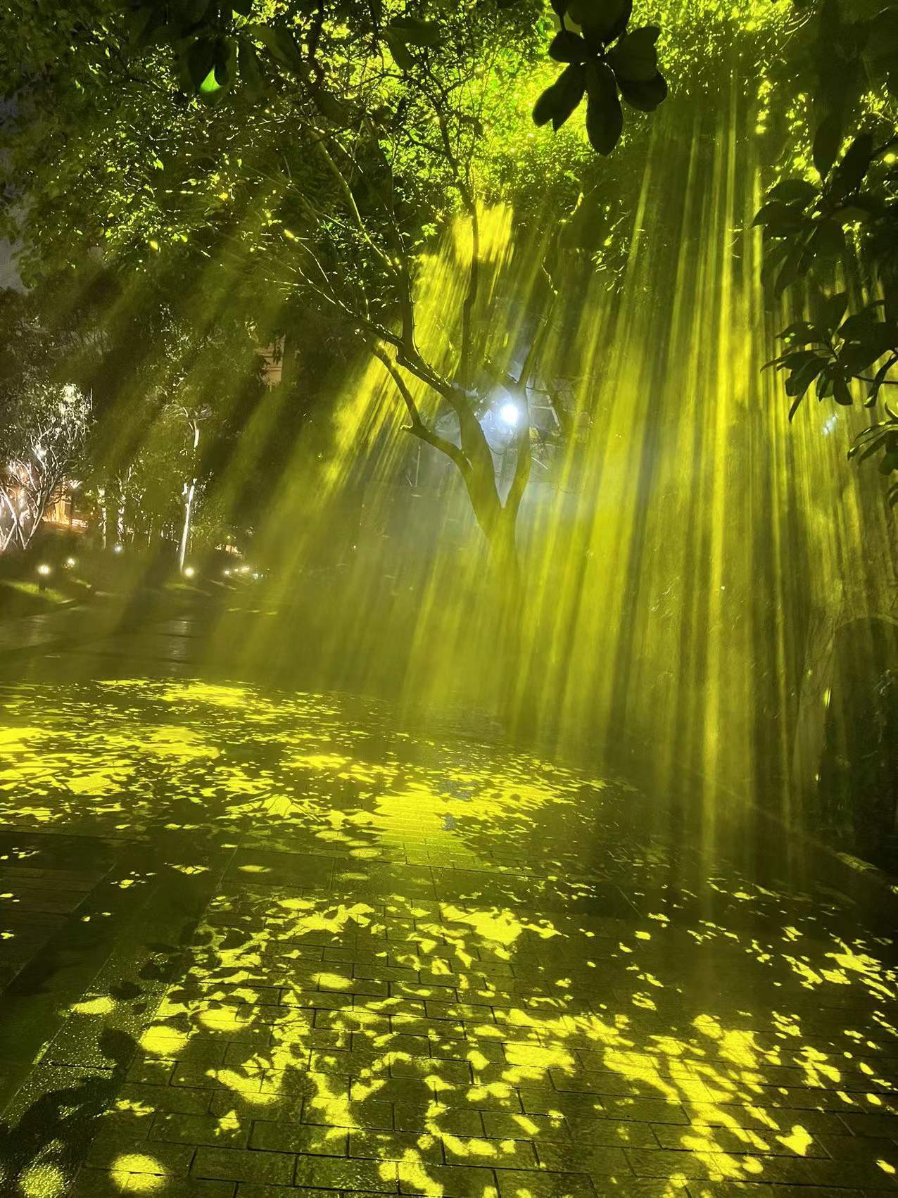 一片绿光洒向地面,通过灯光与光束灯、雾森机等氛围设备相结合,打造出光影摇曳的婆娑林荫道投影景观,让人仿佛置身于原始森林,又仿佛来到梦幻仙境。在冥想步道上,利用投影灯将“字”与“形”相结合,游客在文字的“田垄”上一路用心走过,沐浴光的洗礼,感受温馨、治愈心灵。罗曼·罗兰的诗句、鲁迅的警言,都是游客步道上的诗意存在。而秘境物语主题,则希望路过的行人在繁复忙碌的生活中邂逅这样一处宁谧,稍作停歇、安抚心绪。