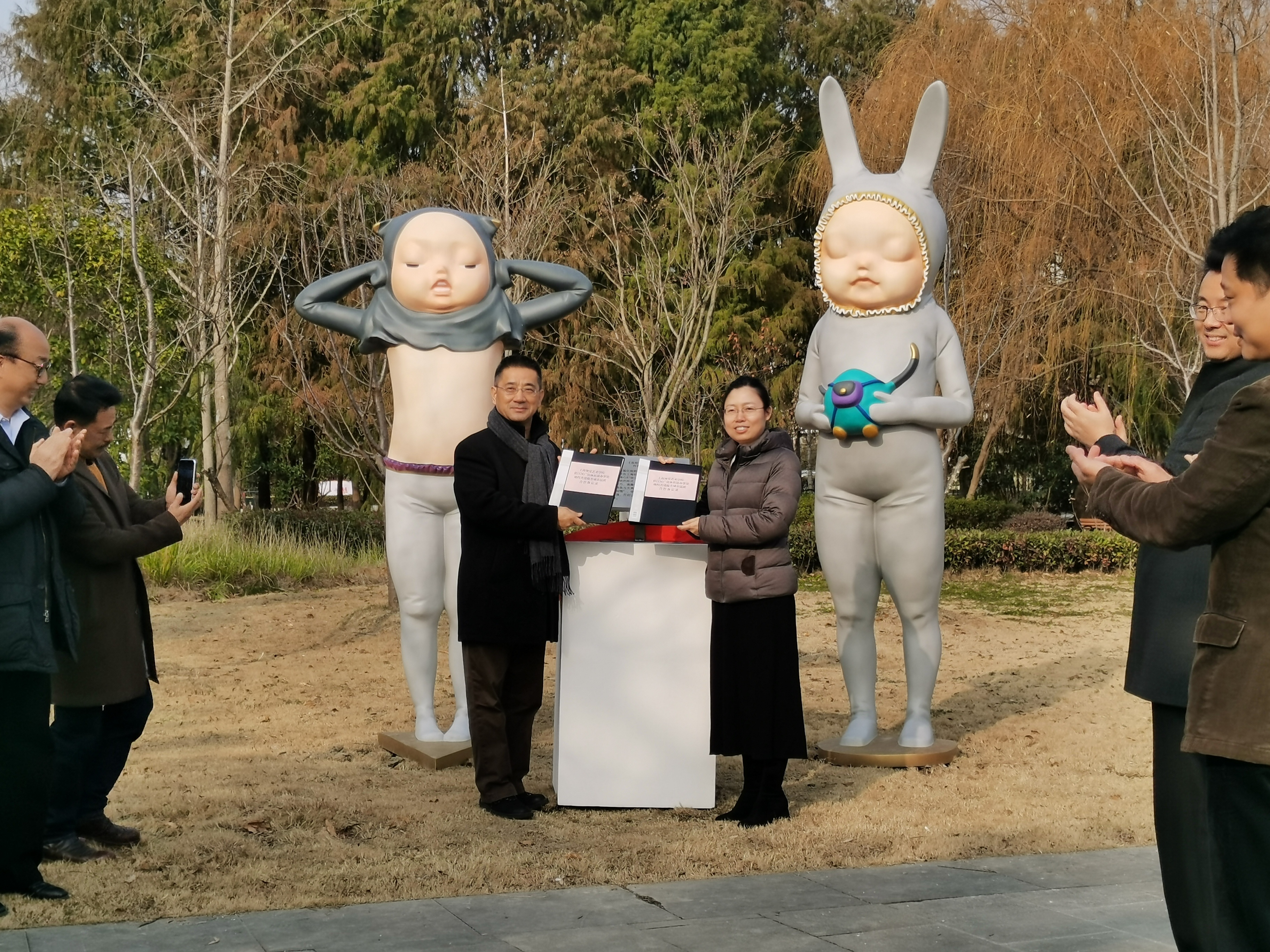 一个头戴猫耳帽,调皮可爱;一个手捧小怪兽,闭目沉思。最近,文汇路龙腾路口的绿地上悄悄冒出一组名为“是那个小可爱”的卡通雕塑。1月18日,设计创作单位上海视觉艺术学院与广富林街道共同为“小可爱”揭牌,并举行地校共建提升城市品质签约仪式。