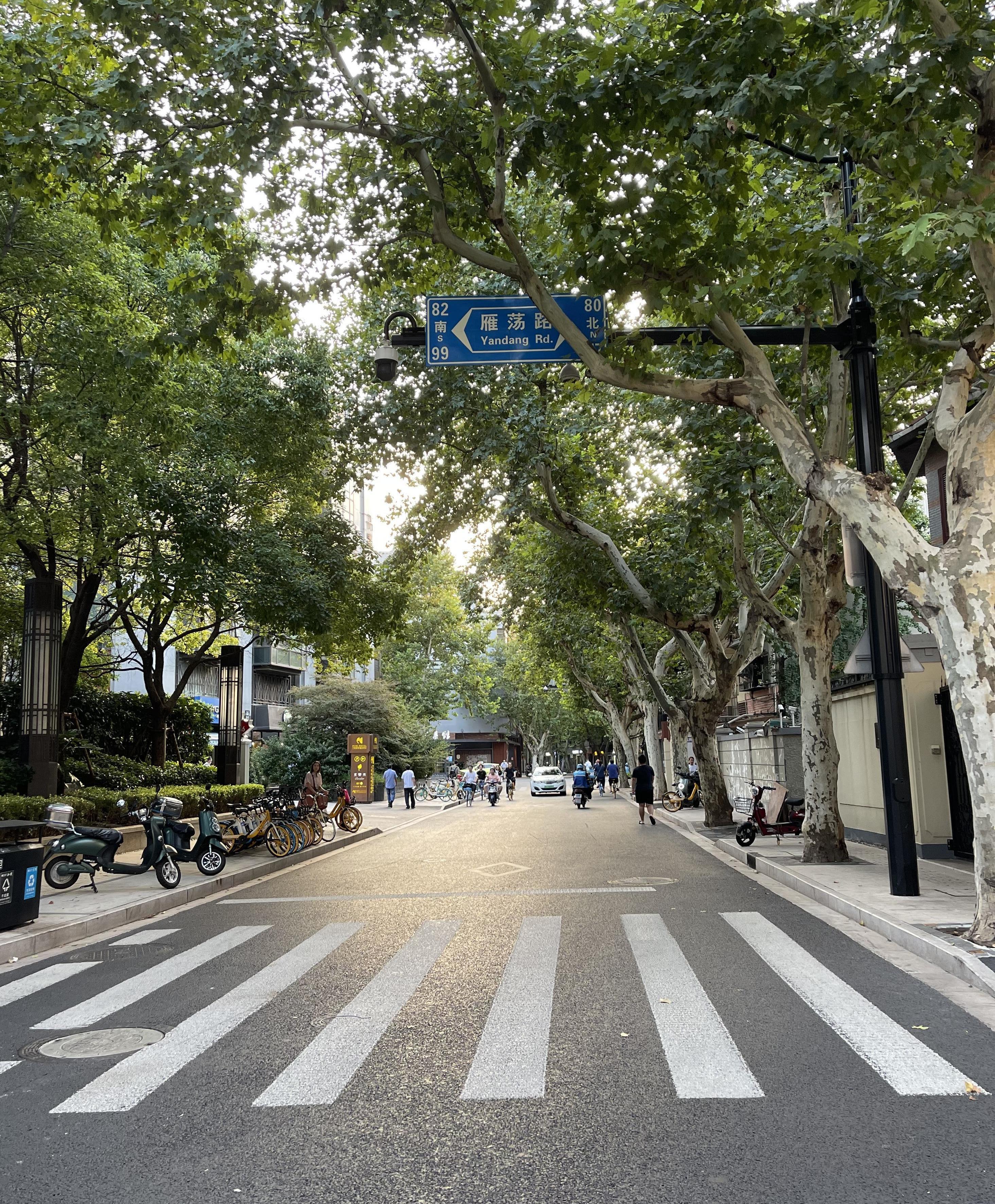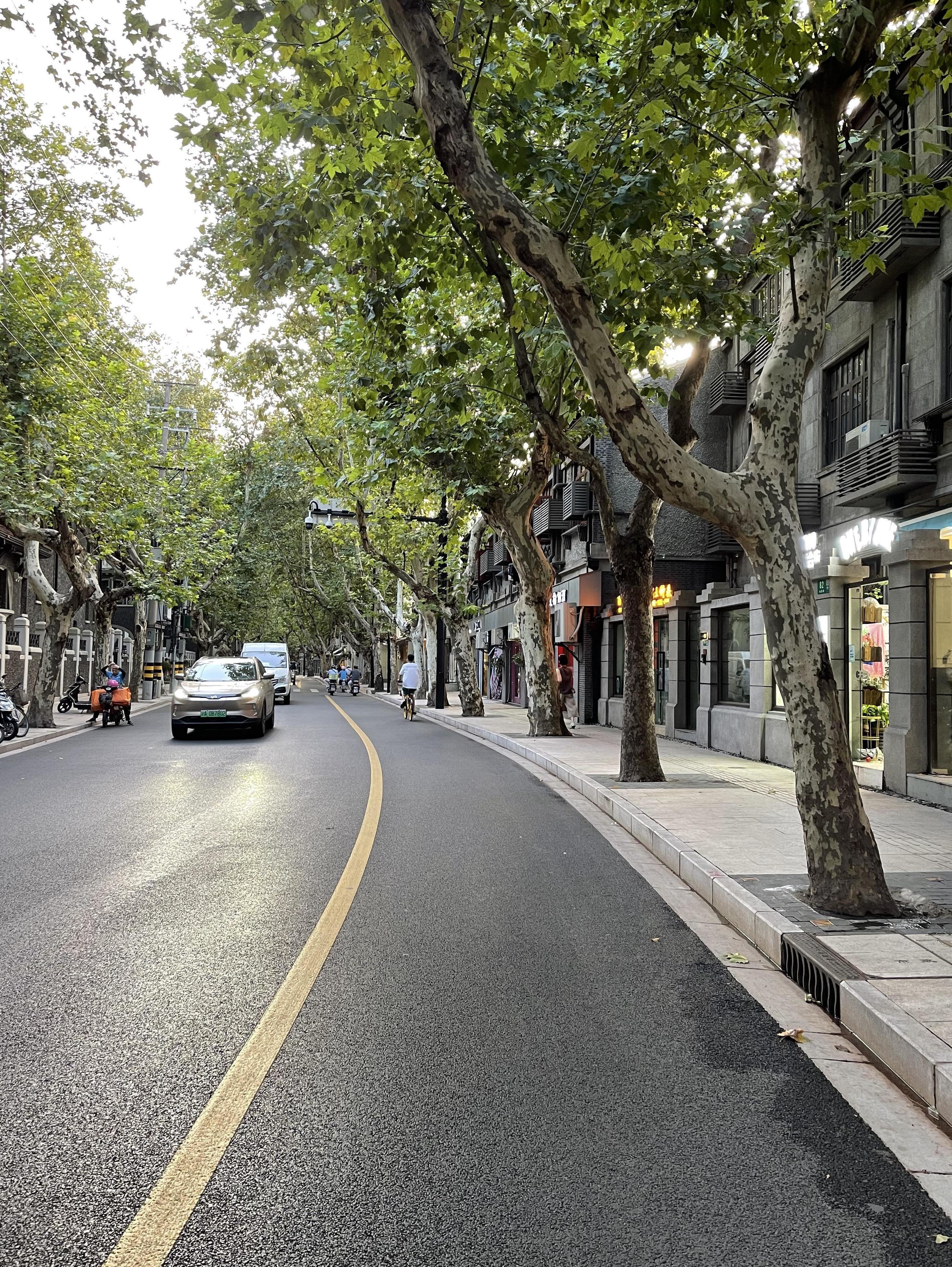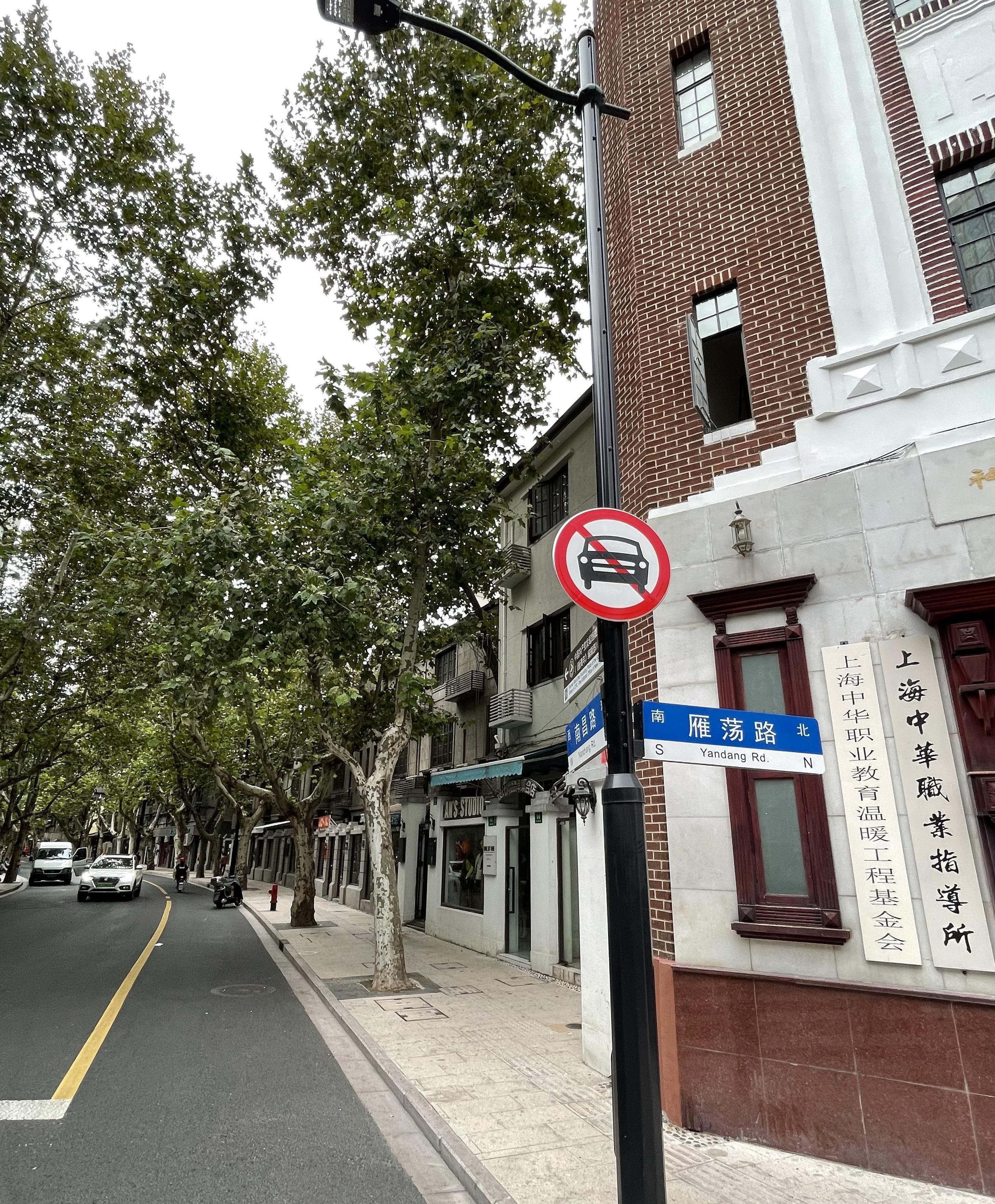 做好“减法”的同时,景观却在不断做“加法”。为使道路与周边建筑相互辉映,区市政部门在对路面重新摊铺时,将原来灰色系的人行道地砖,替换为偏暖色调的红黄色系花岗岩,与周边红、黄、灰色调的历史保护建筑外立面相融合,更好烘托南昌路浓厚的历史文化氛围。同时,把道路整治从路面延伸到铺装、绿化、灯光、景观、城市家具等设施,实现全要素品质提升。比如,从历史风貌元素中提炼出富有海派艺术美感的“南昌路”LOGO字体,被制作成小方砖镶嵌在沿线树池铺装中,引导游客追寻街道美学印记。通过全要素整治,百年南昌路达到了“线清、杆合、箱隐、景美”的效果。