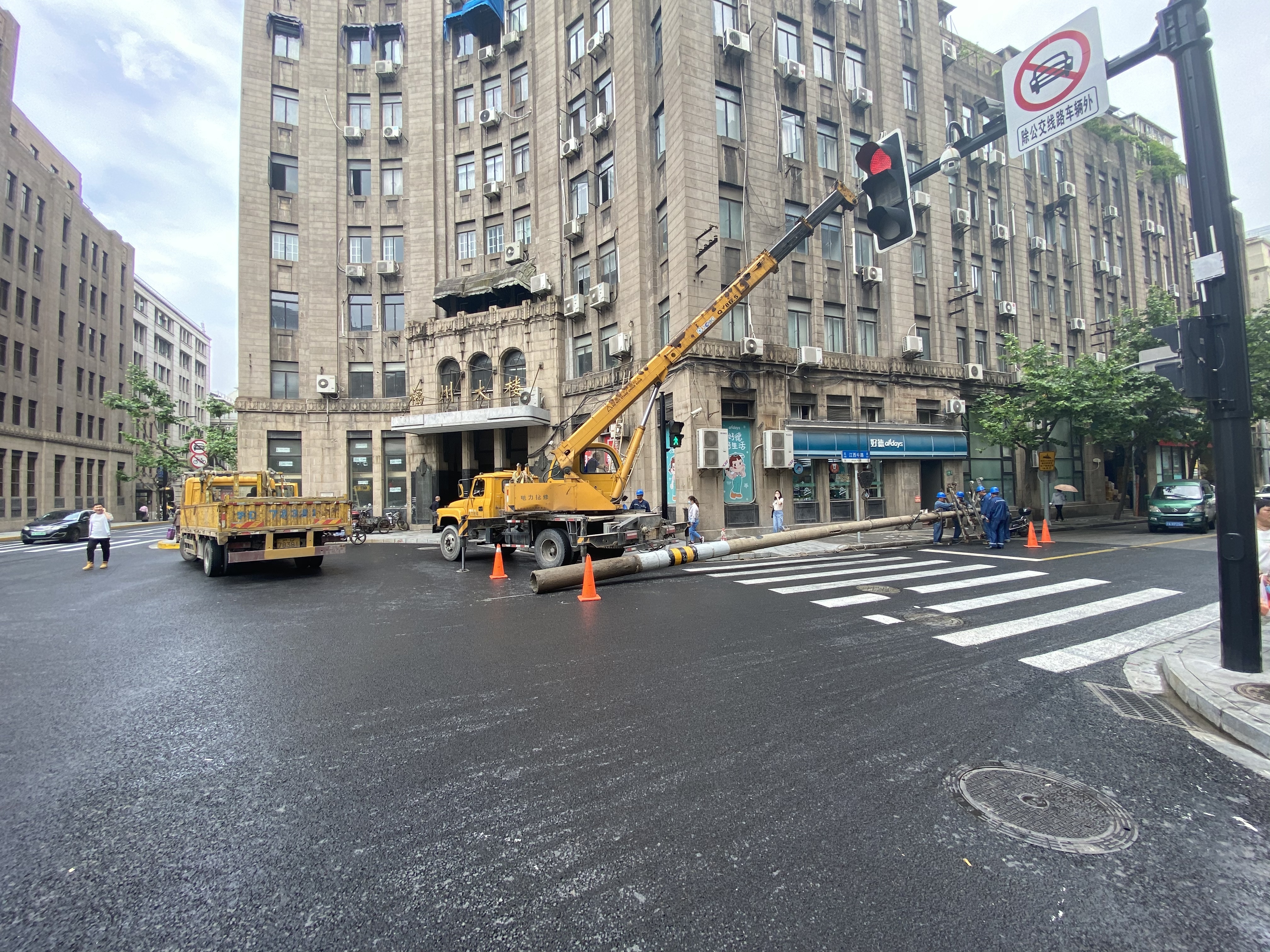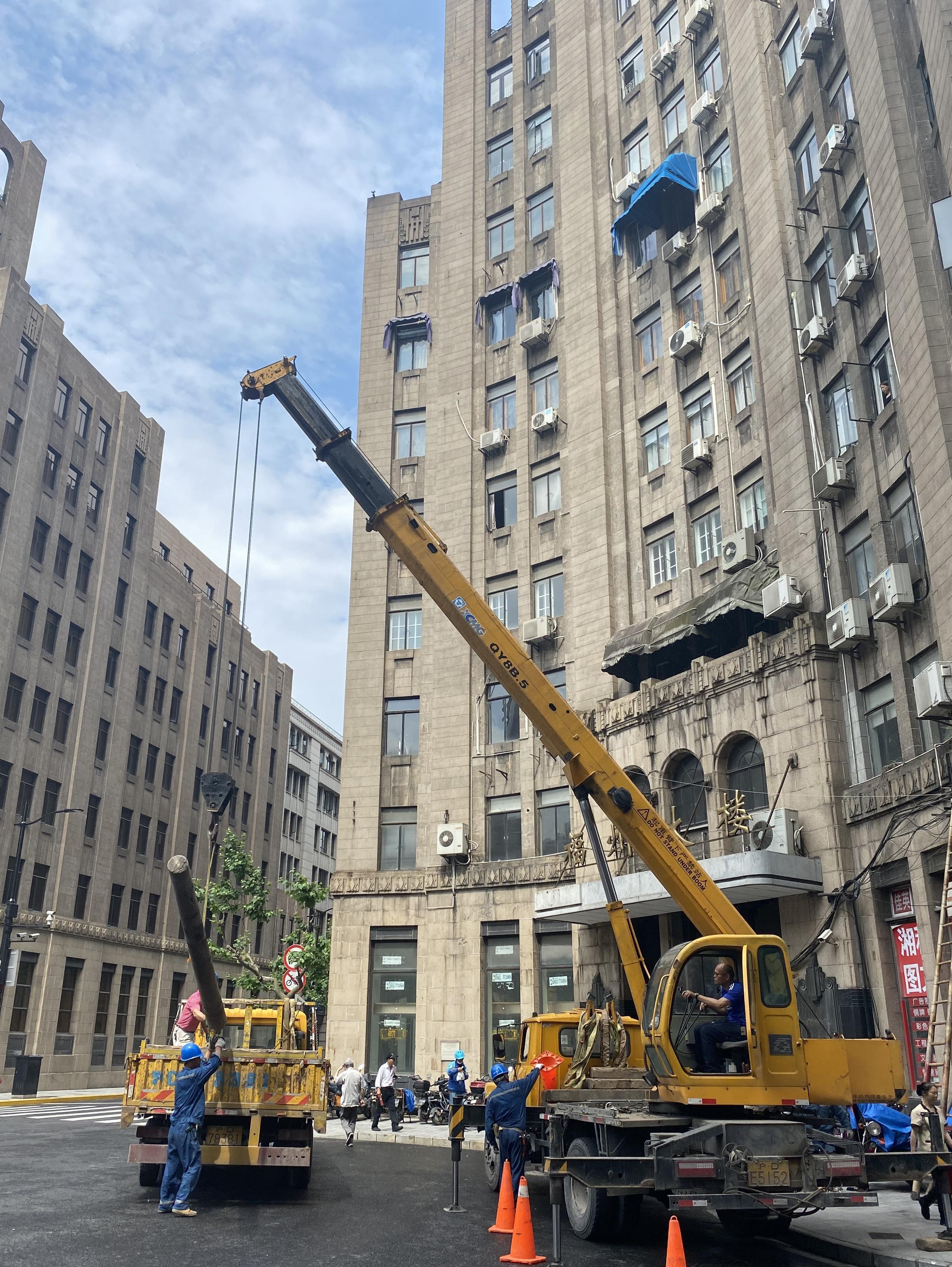 其中最有代表性的,当属拥有近百年历史的老市府大楼周边的焕新。这座始建于1922年,位于福州路、江西路、汉口路之上的环形城堡式大楼,是一座极具特色和代表性的历史保护建筑。但是,一根根杂乱无章的黑色线圈、线缆总悬挂于建筑周边,站在老市府大楼正门前,无论从哪个角度拍,都很难拍到一张“无遮挡”美图。