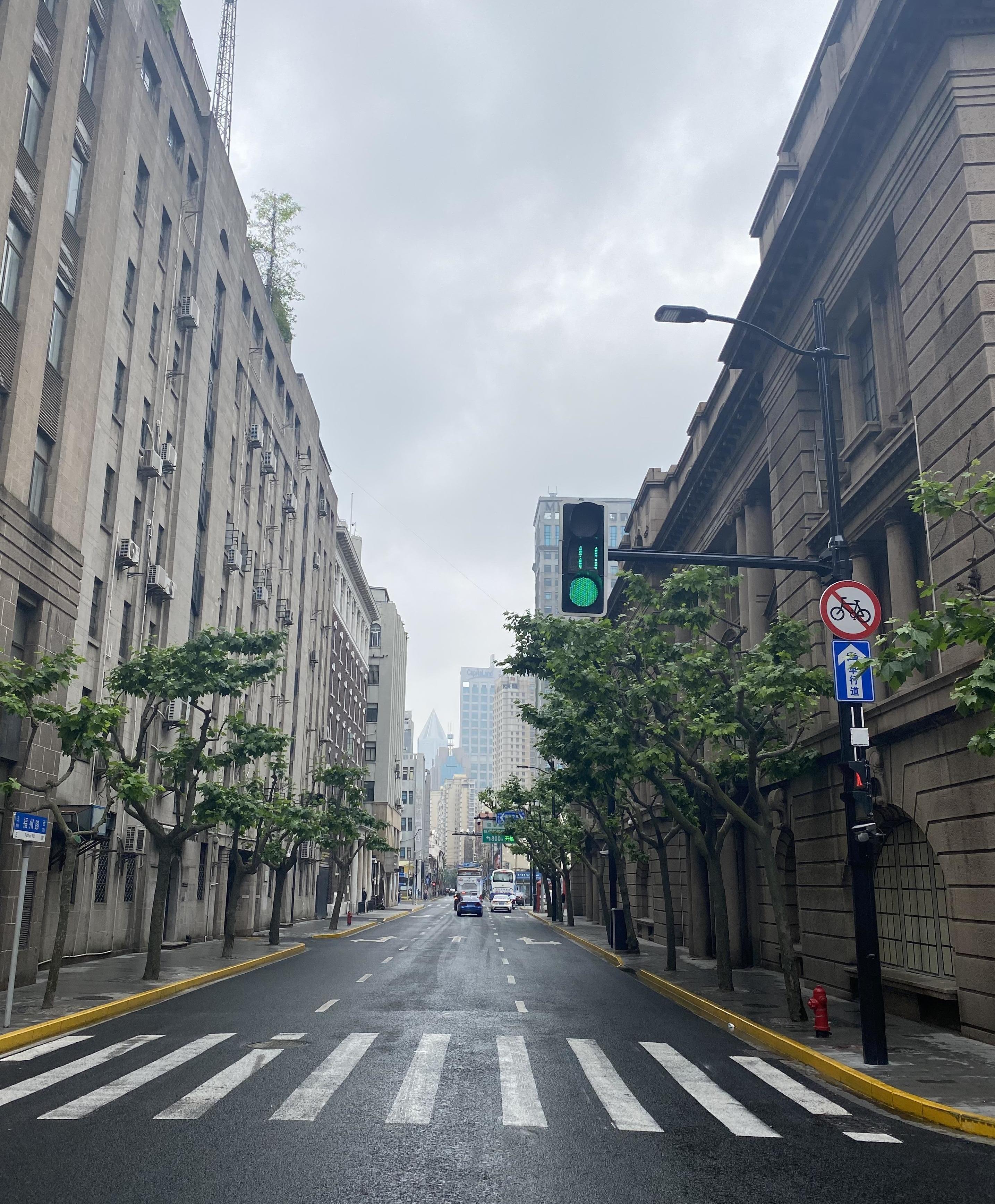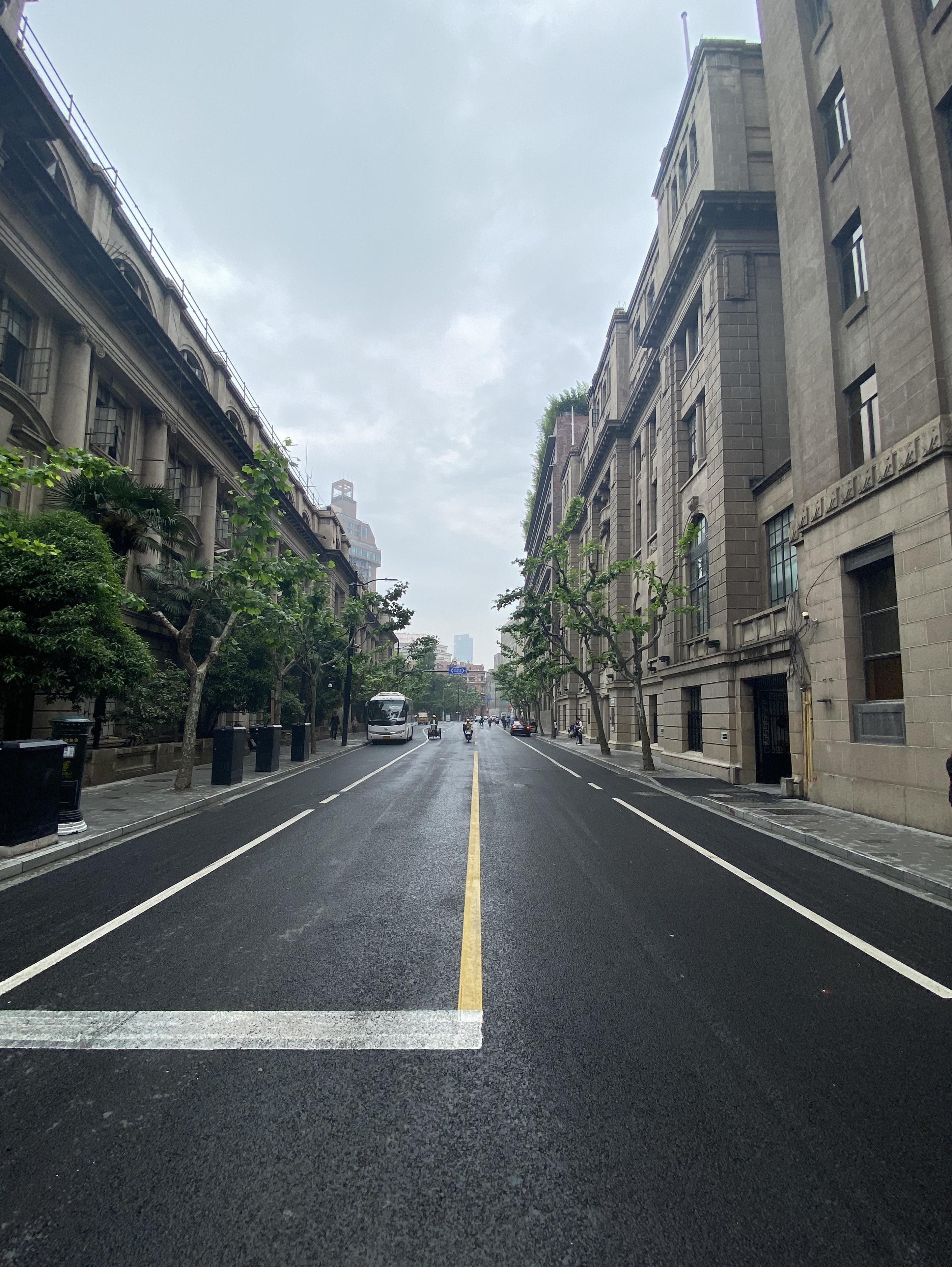 如今,犹如蜘蛛网般的黑色线圈线缆,都不见了,工部局大楼旁的天空清朗洁净了;道路上,多余的杆件减少了,释放出的人行空间,使道路变得舒朗;新铺的青灰色的花岗岩人行板材,契合了外滩第二立面的建筑风格。
