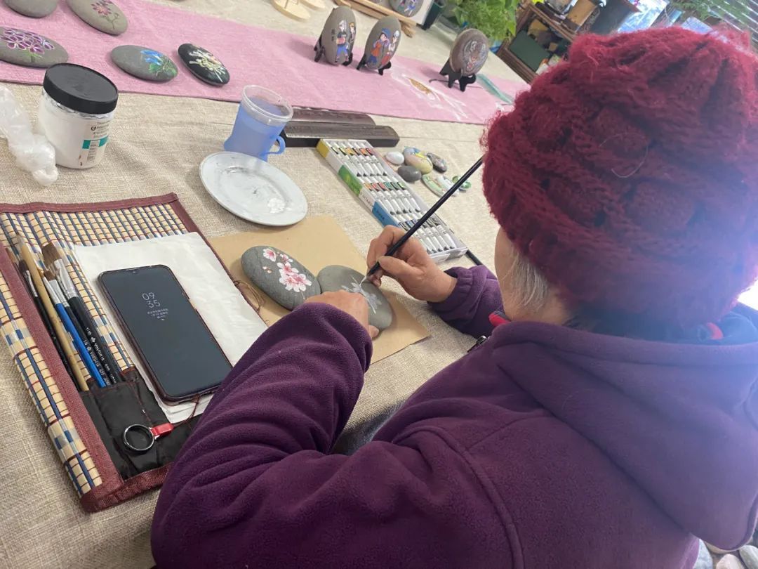 大家先用画笔在石头上画出底色,待干之后再用粗细不同的工具蘸上颜料进一步加工。用描线笔细心勾勒图案,然后进行局部上色,再一步一步加深色彩,在宽大的绘画桌南侧,摆放着李琴和居民的平日作品,活灵活现的小动物,栩栩如生的花卉,惟妙惟肖的人物......一块快普通小石头在大家的手下变得鲜活起来。