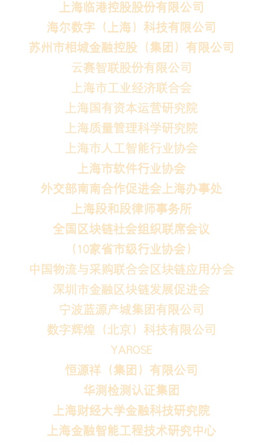 本届盛典由中共上海市委网络安全和信息化委员会办公室、上海市经济和信息化委员会、上海市科学技术委员会、上海市科学技术协会指导,上海区块链技术协会主办,上海长三角区块链产业促进中心、上海科技发展基金会、上海市科普教育展示技术中心(上海市国际科技交流中心)、上海中科智慧城市发展研究院、上好佳(中国)有限公司、上海金桥信息股份有限公司、上海零数科技有限公司、北京众享比特科技有限公司、上海泰砥科技有限公司、蚂蚁区块链科技(上海)有限公司、上海玳鸽信息技术有限公司、上海可一澈科技有限公司、上海朴薪环保科技发展有限公司、上海市徐汇公证处、上海君伦律师事务所协办。