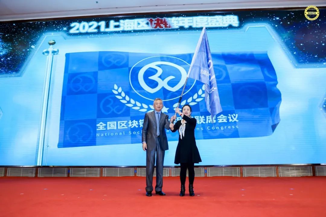 全国区块链社会组织联席会议顾问、上海区块链技术协会法律专业委员会主任、上海政法学院教授蒋坡为第二届全国区块链社会组织联席会议轮值主席王奕授旗。