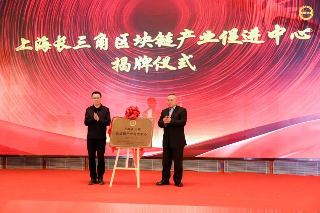 上海市科学技术协会党组书记、副主席马兴发,上海市经信委总工程师张宏韬为上海长三角区块链产业促进中心揭牌