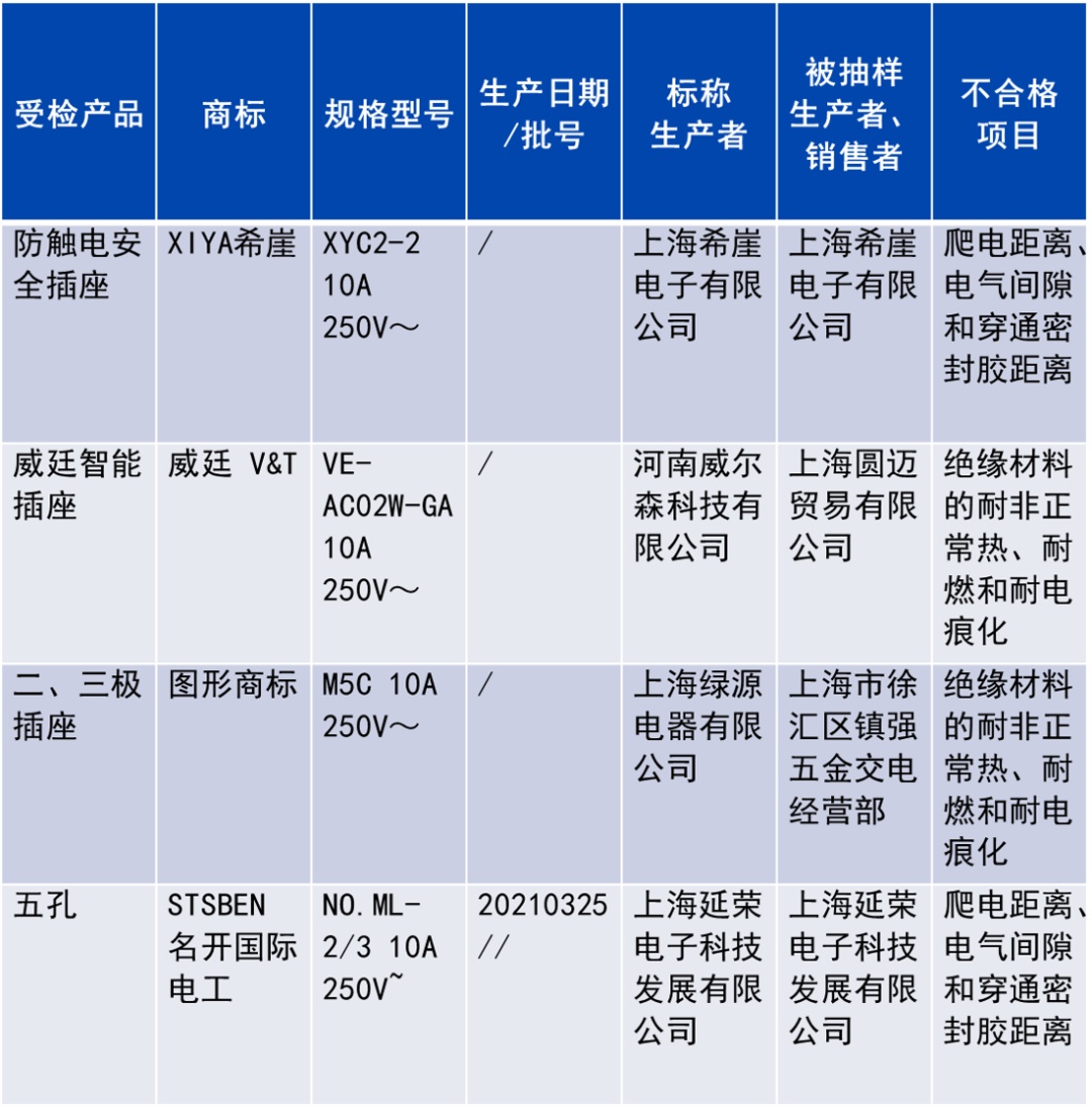 2021年上海市家用和类似用途插头插座产品质量监督抽查不合格产品