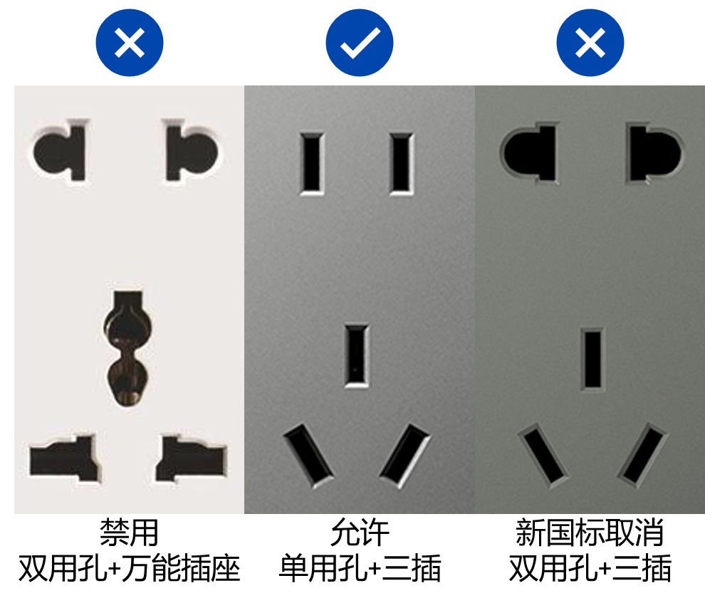 在新国标的实施下,插头插座的生产、销售存在一段过渡期,市面上能看到各种型式的产品,在购买新的插头插座时,建议选择符合新国标允许的型式,更加安全可靠。