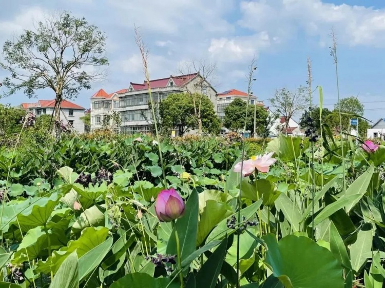 道路沿线池塘种植荷花,和沿路的稻田相互映衬,增加绿化小景,绿化植被丰富,可谓四季有景各不同,形成了白鹤飞舞、稻花飘香、安逸宁静的江南水乡美景,为村民营造了优美宜居的生活环境。