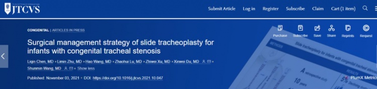近日,国家儿童医学中心(上海)、上海交通大学医学院附属上海儿童医学中心心胸外科王顺民团队在国际权威期刊《The Journal of Thoracic and Cardiovascular Surgery》发表题为“Surgical management strategy of slide tracheoplasty for infants with congenital tracheal stenosis (婴儿先天性气管狭窄“滑片”气管成形术的手术治疗策略)“的临床研究结果。