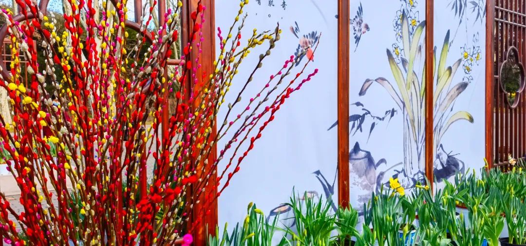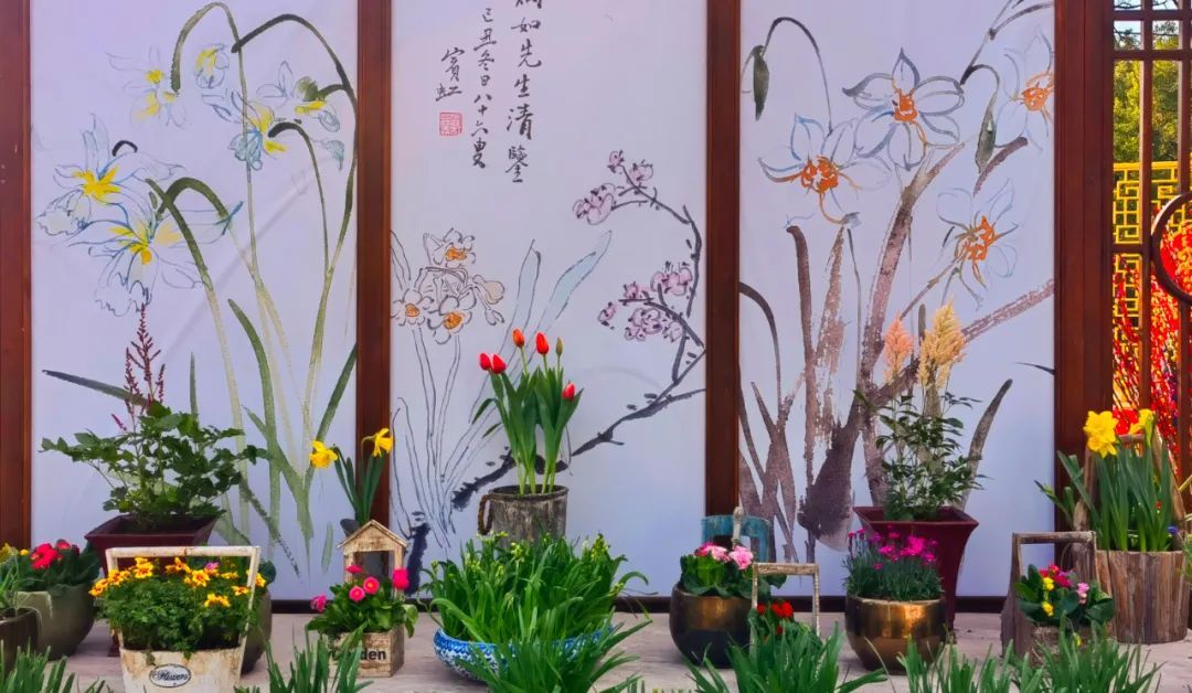 展区主体景观为一个新春贺卡造型,造型中融入中式框景,地面应用水仙、杜鹃、瑞香、银芽柳、石竹等年宵花卉以及多色系灯笼元素,一派花团紧簇的景象,充分烘托了新春佳节的热闹氛围。