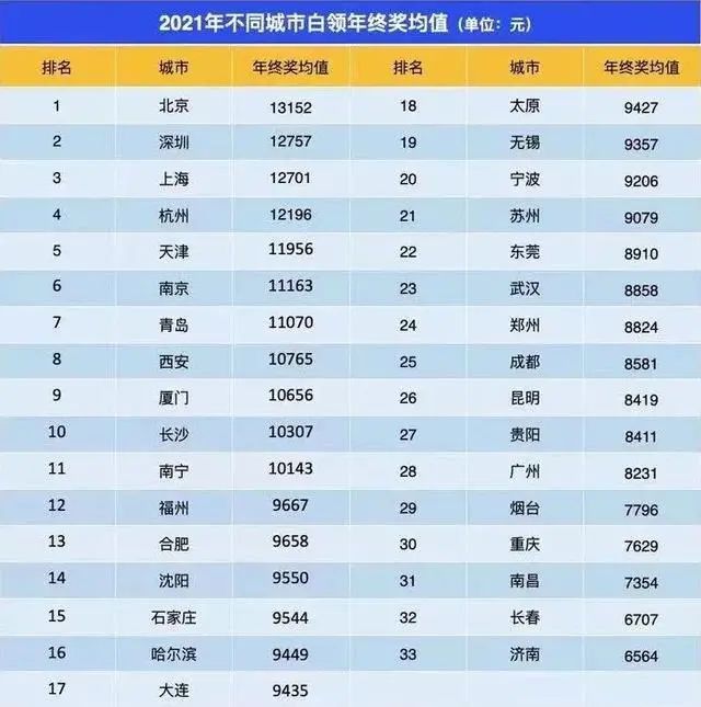 数据显示,2021年白领年终奖均值最高城市前三是北京、深圳、上海,分别为13152元、12757元、12701元。