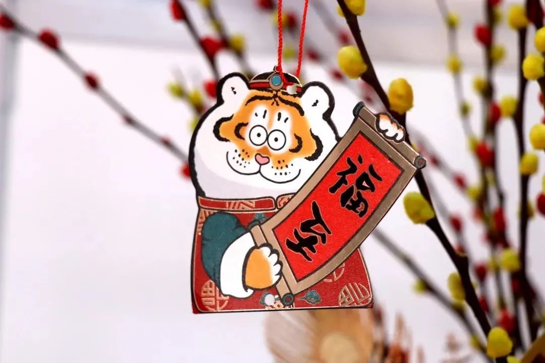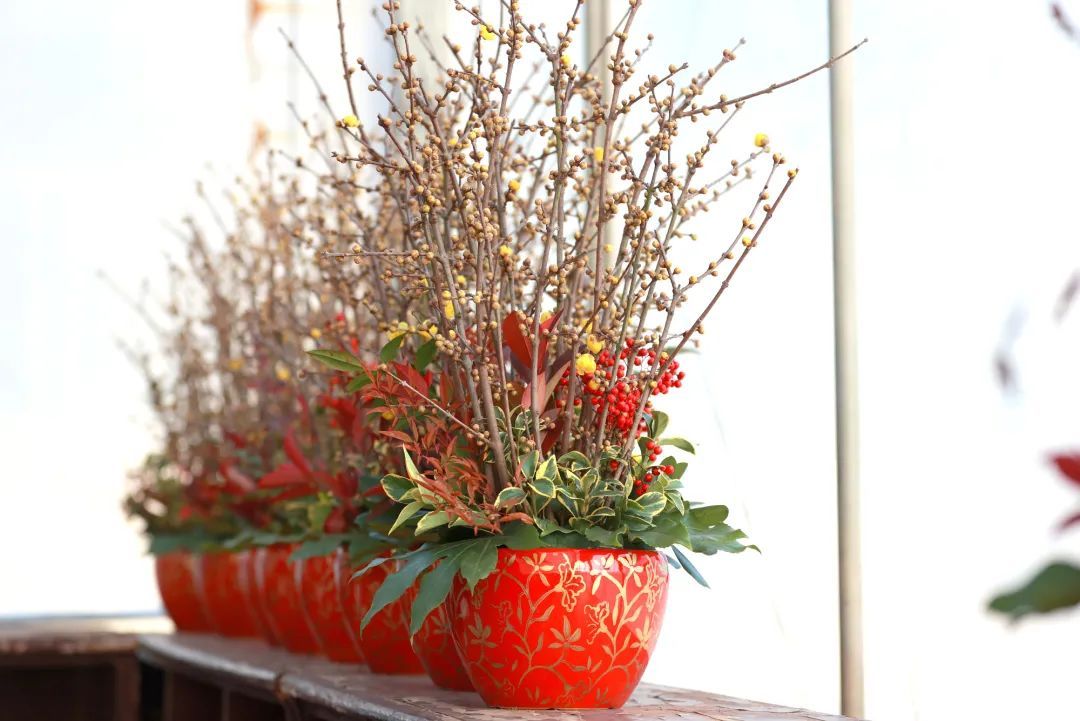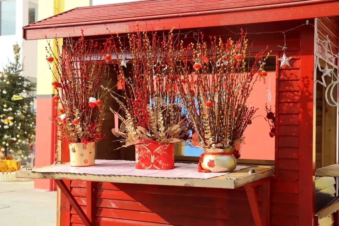 花桶上装饰有“平安喜乐”“新春快乐”“大吉大利”等寓意吉祥如意的标语,拉满过年的仪式感和氛围感~