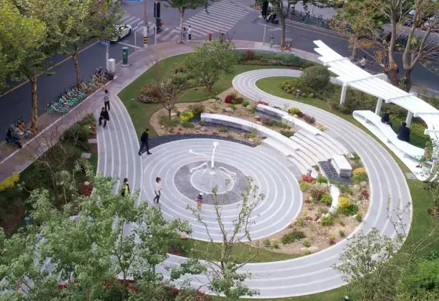 同时,还增设了混凝土塑性而成的座椅和叶片形的廊架,组成有人可以驻足休憩的空间。此外,威海路花园还是静安法制文化绿地,定期向市民进行普法宣传。