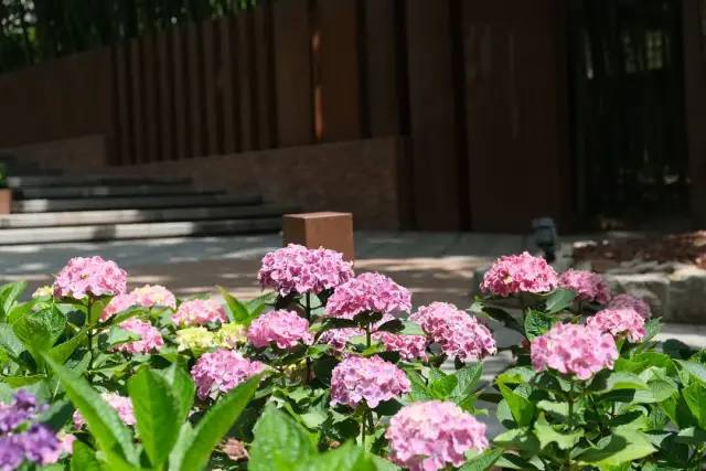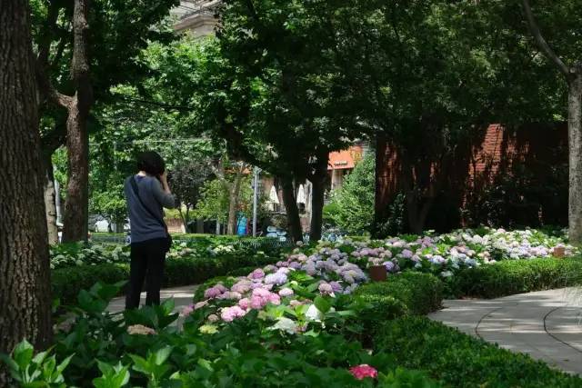 在余姚路康定路路口处片植蓝色和粉色无尽夏,逐渐过渡至中央庭院处点植各品种园艺八仙花。待炎炎夏日,园内一片蓝紫色绣球花海。