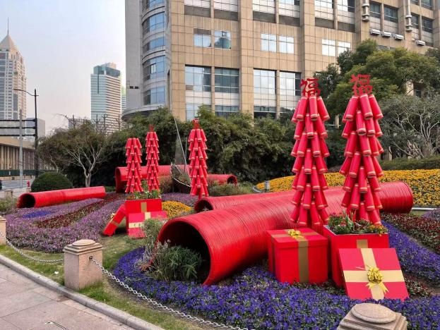 在武胜路黄陂路绿地(37号绿地),在人民大道黄陂路绿地,金外滩集团下属科植绿化公司,以代表着喜庆、热闹与祥和的“中国红”为主色调,采用鞭炮、礼盒、福字等寓意非凡的摆件与色彩鲜艳的花草进行搭配,以焕然一新的面貌迎接着农历新年的到来。