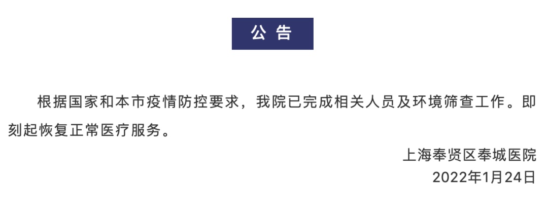 奉城医院发布恢复正常医疗服务的公告