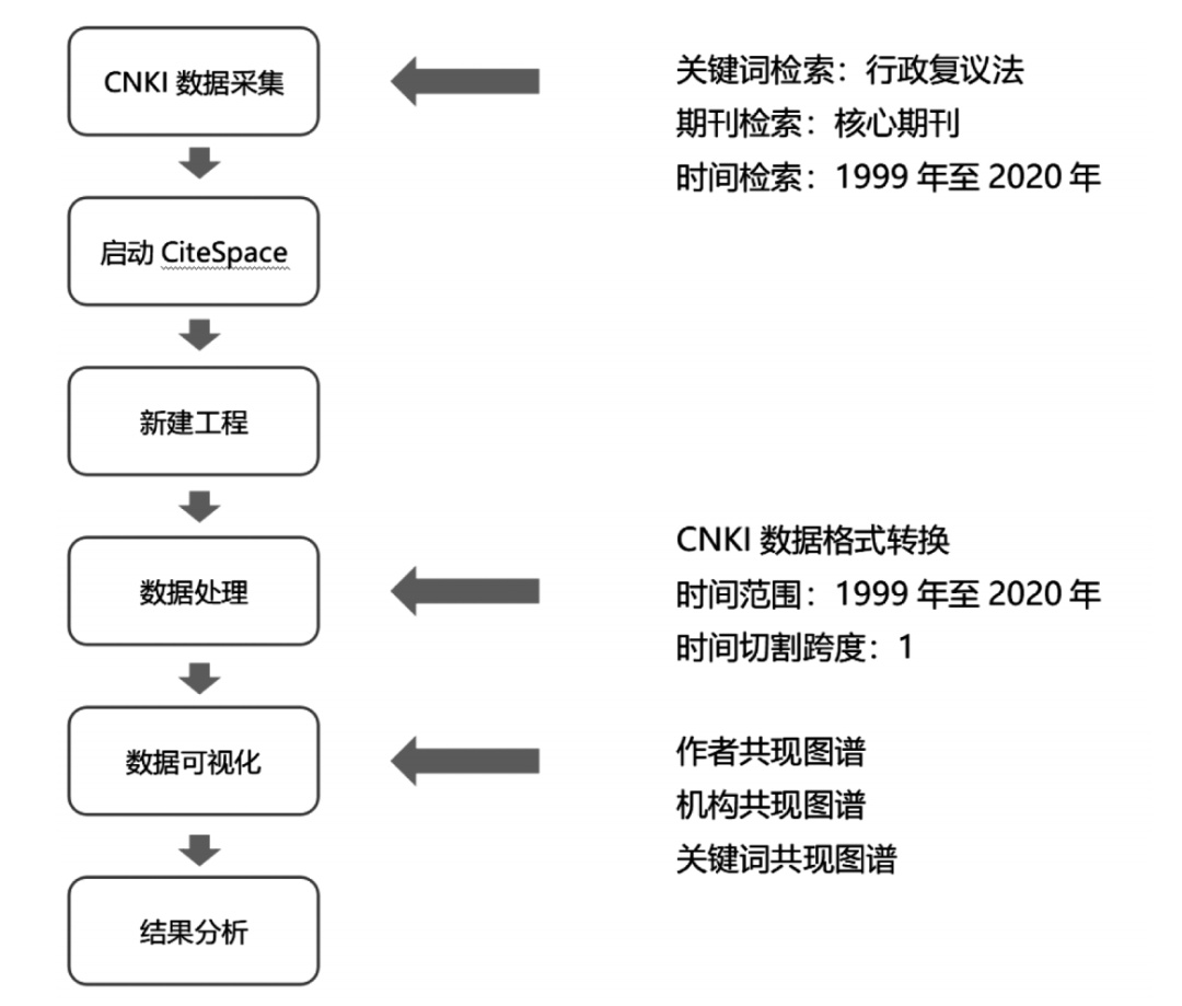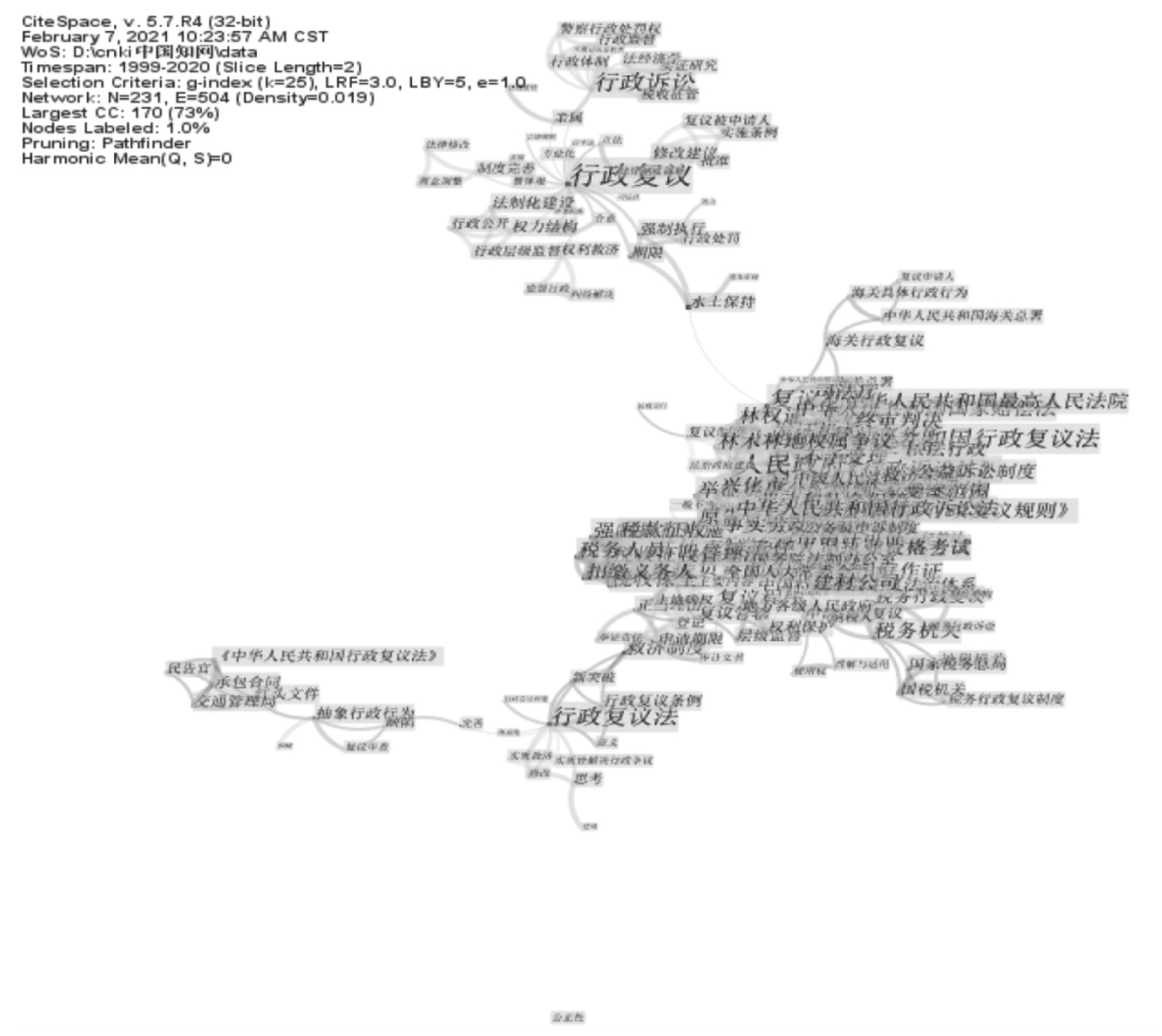 1999年4月29日,《中华人民共和国行政复议法》(以下简称行政复议法)在第九届全国人民代表大会常务委员会第九次会议上通过,并于1999年10月1日起实施。行政复议法的颁布实施是我国民主法治建设进程中的一件大事,对法治国家、法治政府、法治社会一体建设产生了深远影响。行政复议法颁布实施20多年来,曾于2010年被列入国务院立法计划,2014年列入全国人大常委会立法工作计划,于2009年和2017年分别进行了两次小幅修改。新形势下,我国经济社会的全面快速发展对党和国家提出了新的要求,由此开启全面建设社会主义现代化国家新征程,加快推进法治国家、法治政府、法治社会建设,着力实现国家治理体系和治理能力现代化。随着公民民主、法治和权利意识的觉醒与增强,各领域“民告官”案件激增,在实践过程中逐渐暴露出行政复议案件过少、行政诉讼压力激增、行政复议效率低下、行政救济效果滞后、复议决定维持率高、复议机关公信力低等问题,行政复议制度优势未能得到充分发挥。显然,行政复议制度实践推动的改革势在必行,行政复议法修订进程加速。2018年十三届全国人大常委会公布的立法规划将行政复议法(修改)列为“第一类项目:条件比较成熟、任期内拟提请审议的法律草案”,行政复议法修改再次提上议事日程。2020年11月24日,《中华人民共和国行政复议法(修订)(征求意见稿)》发布,明确了行政复议化解行政争议主渠道地位,提出复议机关应加强信息化建设,对行政复议的范围、申请的期限、申请的提出、管辖、受理、审理、决定等做出了更加详细明确的规定。其中,对审理程序做出了简易程序与一般程序的区分。长期以来,围绕行政复议法修改,学界进行了大量有的深度研究和有益探索,这些研究成果为该法的全面修订工作提供了重要参考,对推动行政复议制度紧跟时代发展需求、公正高效解决行政纠纷起到了积极作用。这次行政复议法的修订工作聚焦明确行政复议范围与功能定位、完善复议程序等方面,对深化新一轮的行政复议制度改革,加快依法行政和行政一体化建设具有重要意义。鉴于此,本文尝试使用CiteSpace可视化工具,对关于行政复议法修改研究的文献进行分析,以期对行政复议法修改研究进行回溯和展望,梳理其热点与趋势,助力行政复议法修改及其研究的深化。