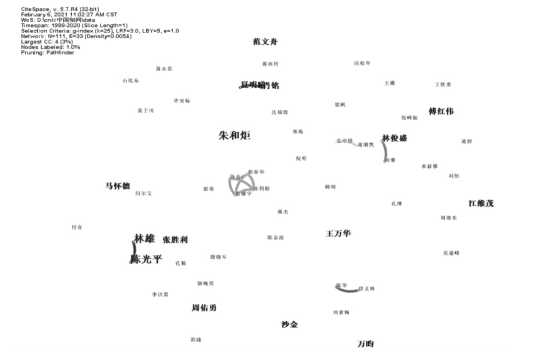 作者共现图谱直接反映作者发文次数,可以较为全面地呈现对该问题进行研究的作者的总体情况。将时间分区(Year Per Slice)设置为1年,节点类型(Node Types)设置为作者(Author),其他参数设置为默认值,运行CiteSpace,在控制面板中,将起始点(Threshold)设置为0,即对每个时间分区内出现的所有作者进行分析,获得作者共现图谱图,如图3所示。