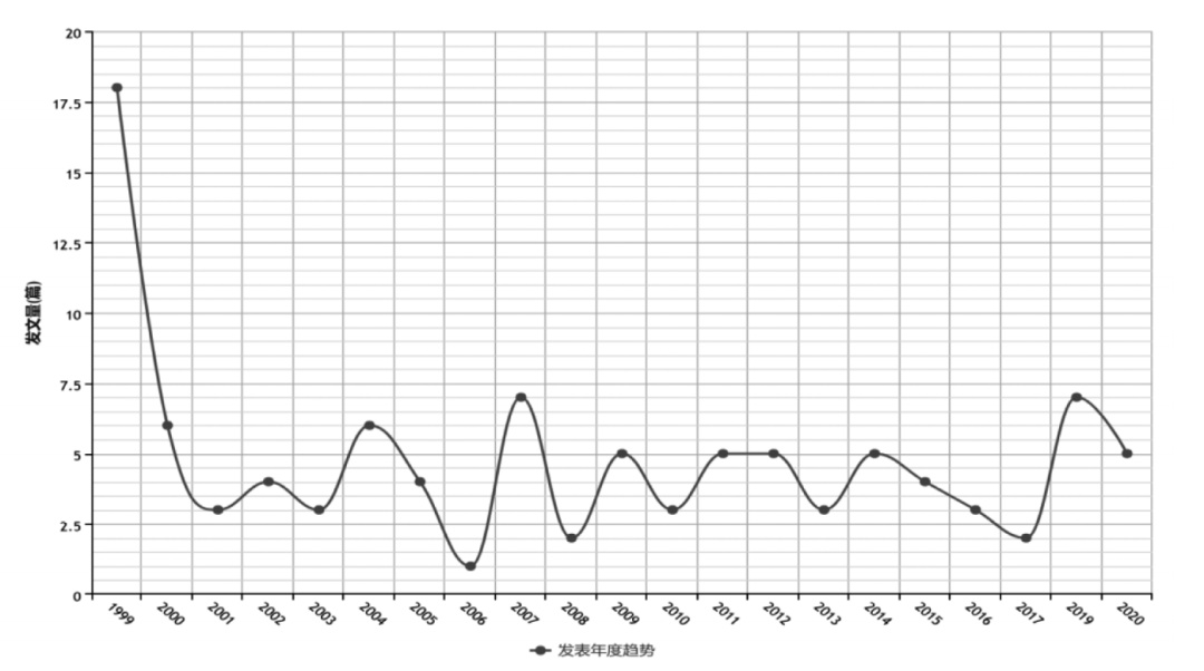 总体趋势分布如图2所示,1999~2020年期间各年行政复议法修改相关研究的发文数量,可以看出学者就行政复议法修改主题研究的总体情况。从图2可以看出,关于行政复议法修改的研究大致呈现出以下两个方面的特点。一方面,1999年是行政复议法研究最为活跃的年度,学者聚焦行政复议法的制定和颁布实施开展了大量研究,大致符合法律颁布前学界研究热度分布规律,在此年度也有不少的相关研究对行政复议法制定的不足进行了深入探讨,以期在未来可能的修改中进一步完善。另一方面,在1999年之后整个进入一个较为平稳的研究时期,一直持续到2020年,在这一阶段行政复议法《行政复议条例》施行过程中,既是行政复议相关制度的实践初期,学者们的观望期和研究点以及研究方向的探寻时期,也是学界针对相关问题的持续研究,研究视角和研究方向逐渐增多,每年的研究成果数量趋于稳定,这其中对行政复议法的修改研究一直在持续的积累和深化之中。显然,在《行政复议法实施条例》颁布(2007)及行政复议法实施二十周年(2019)这样具有重要意义的年份,研究成果出现了较为明显的小幅增加,这同样符合研究热度分布规律。