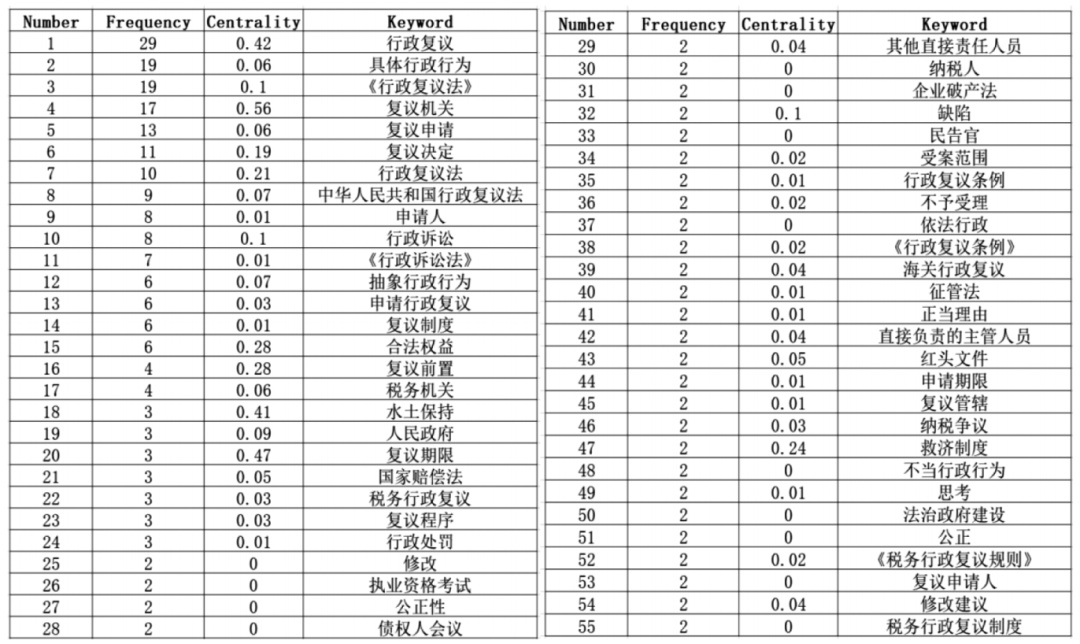 由表1关键词频次表可知,“复议机关”“复议期限”的中心度最高,分别是0.56、0.47,表示在行政复议法的研究中是主要的关键词。如表1所示,“行政复议”“中华人民共和国行政复议法”“行政复议法”“《行政复议条例》”等与本研究主题一致,暂不做具体分析;“复议机关”“人民政府”等涉及行政主体及相互之间的关系;“具体行政行为”“抽象行政行为”“受案范围”“不予受理”等涉及行政复议的管辖范围;“复议程序”“复议前置”“复议申请”“复议决定”“复议期限”“救济制度”“复议管辖”等涉及行政复议制度的完善;“税收行政复议”“税务机关”“纳税争议”等涉及税收有关的行政复议;“征管法”“国家赔偿法”“行政诉讼法”等涉及行政复议法与其他相关法律之间的关系。此外还有“正当理由”“公正性”“缺陷”“修改”等与行政复议法相关问题。显然,当前有关行政复议法的研究涉及面广、覆盖主题多样。