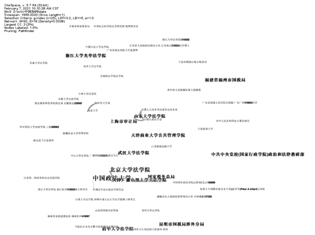 如图4所示,连线代表机构之间有合作,连线颜色的深浅表示合作时间的远近,颜色越深时间越近。字体的大小代表机构发文数量的多或少。N值表示节点的数量为92,E值表示连线的数量为16,密度(Density)值为0.0038,可以看出该数值比较小,说明机构之间的合作比较分散。从图4看,在行政复议法的研究领域最具代表性的核心机构有中国政法大学、北京大学法学院、浙江大学光华法学院。根据已有资料可知,马怀德、王万华、应松年等作者所属单位为中国政法大学,张胜利等作者所属单位为北京大学,范文舟等作者所属单位为浙江大学。此项结果与作者共现图谱中所得结果具有一致性,说明关于作者方面的研究显示的结果具备一定的合理性。