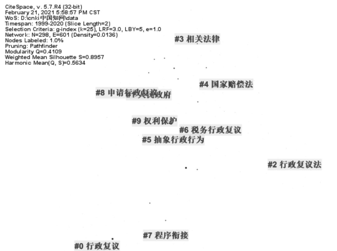 关键词共生成了10个聚类,分别是0行政复议、1人民政府、2行政复议法、3相关法律、4国家赔偿法、5抽象行政行为、6税务行政复议、7程序衔接、8申请行政复议、9权利保护。从研究涉及的范围来看,其中包括税务行政复议、行政复议、抽象行政行为;从研究涉及的程序来看,包括申请行政复议、程序衔接;从研究涉及的有关法律法规来看,包括行政复议法、国家赔偿法和其他相关法律;从研究涉及的主体来看,其包含行政主体,比如人民政府;从研究的目的来看,包括权利保护等。