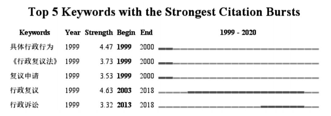 关键词高突现词表是通过显示某一关键词出现的起始和结束时间,从而得出该关键词研究的整体情况的图表。通过分析关键词可以了解到不同时间段行政复议法研究的重点和热点问题。关键词高突现词表表2同样也是在关键词共现图谱的基础上得出的。